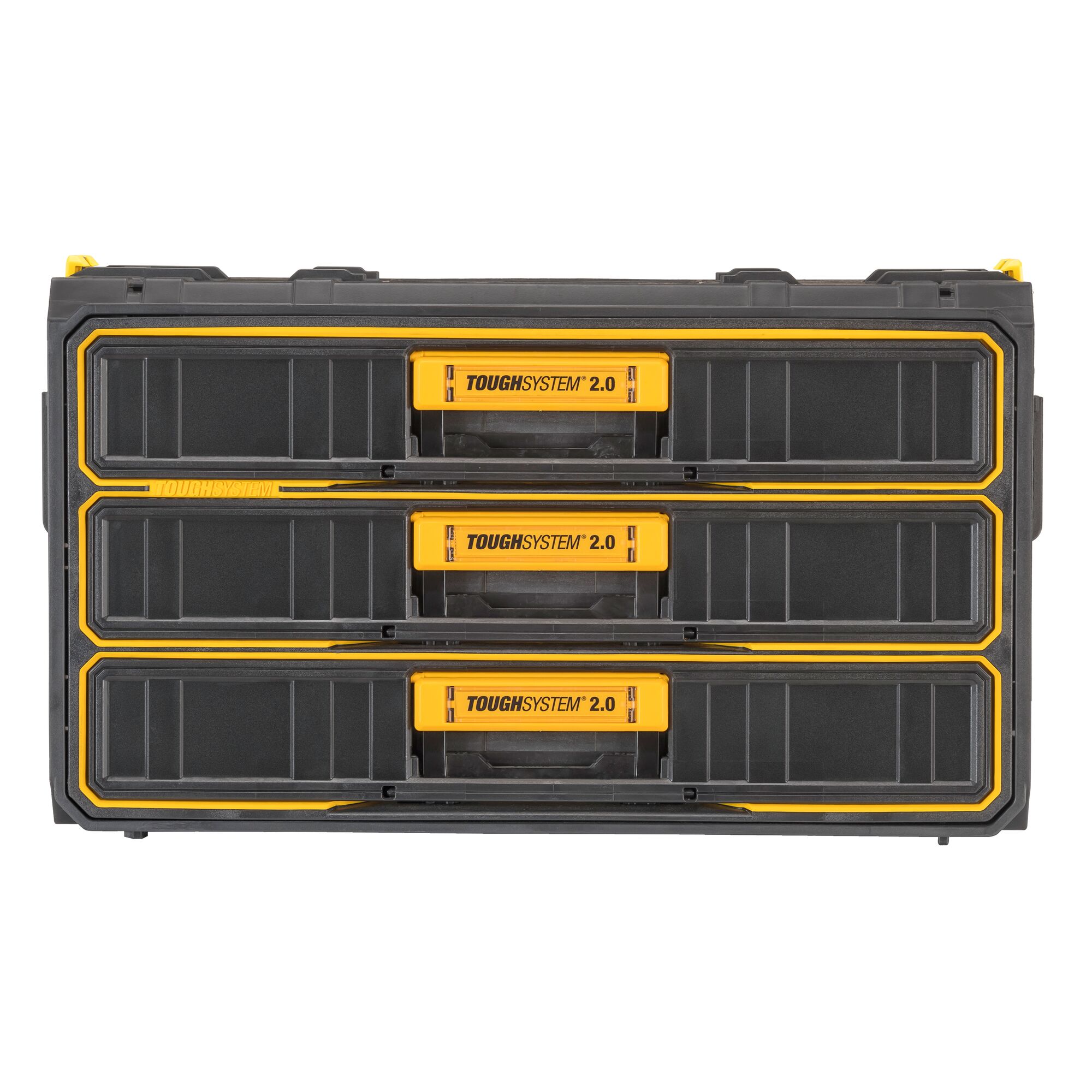 ToughSystem 2.0 Modul mit 3 SchubfächernDrei flache Schubfächer aus schlagfestem Kunststoff (ABS) – direkter Zugang zum Inhalt ohne Demontage anderer Module – bei mobiler oder stationärer VerwendungKugelgelagerte Schienen für ein reibungsloses, zuverlässiges Öffnen ohne Verkanten und eine hohe Haltbarkeit22 kg Belastbarkeit pro Schubfach um mehrere schwere Produkte in verschiedenen Fächern aufbewahren zu könnenNeue selbstverriegelnde Stapelverschlüsse – schnelles Verbinden und Lösen des Moduls mit anderen ToughSystem-Einheiten und WerkzeugkästenIndividuell anpassbare Schilder – schnelleres Finden von WerkzeugenVollständig kompatibel mit ToughSystem 2.0 und 1.0