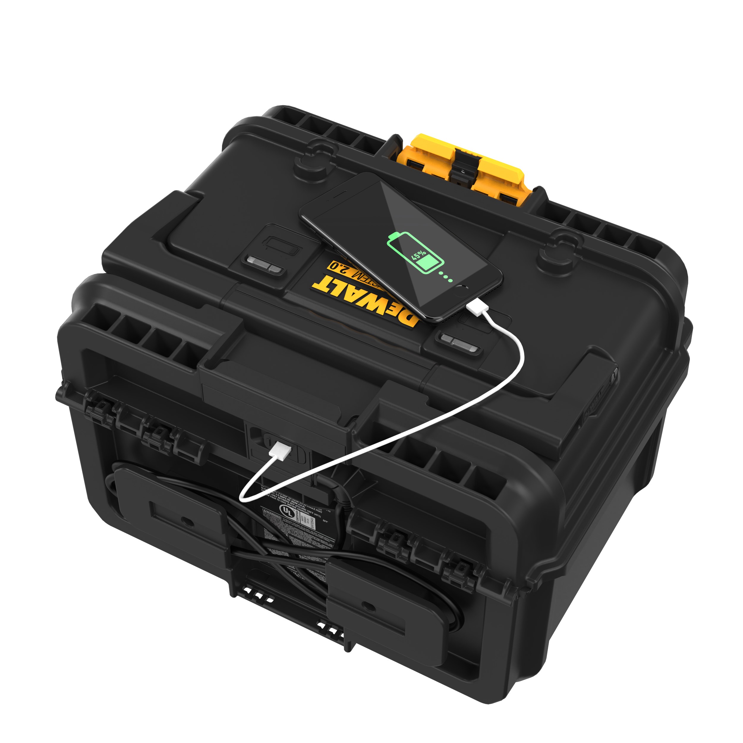 Weltweit erstes Doppel-Ladegerät, integriert in das ToughCase 2.0 Koffer-AufbewahrungssystemBietet Platz zum gleichzeitigen Laden von zwei 18V XR / 54V FLEXVOLT Akkus (4 Ampere Ladestrom)Integrierter Lüfter – beim Laden mit geschlossenem Deckel verhindert der integrierte Lüfter Überhitzungen der Akkus sowie des Ladegerätes selbstDie Ladestandanzeige ist bei offenem und geschlossenem Deckel sichtbarDie Box verfügt über 2 zusätzliche USB-Lade-Ports (1x Typ A und 1x Typ C) zum Laden von Mobil-GerätenFür Akkus, die nicht geladen werden und nicht in Verwendung sind, bietet die Box gleichzeitig ausreichend Stauraum (z.B. bis zu 14x 18V 5Ah XR Akkus)Bei geschlossenem Deckel sind die Akkus durch die robusten Metallverschlüsse und die mit IP65 zertifizierte Dichtung im Deckel optimal vor Umwelteinflüssen geschütztKomplett kompatibel mit dem TOUGHSYSTEM 2.0 – Die Charger Box hat die Größe eines halben Moduls und kann mit anderen Boxen halber Größe oder normalen Boxen verbunden werden