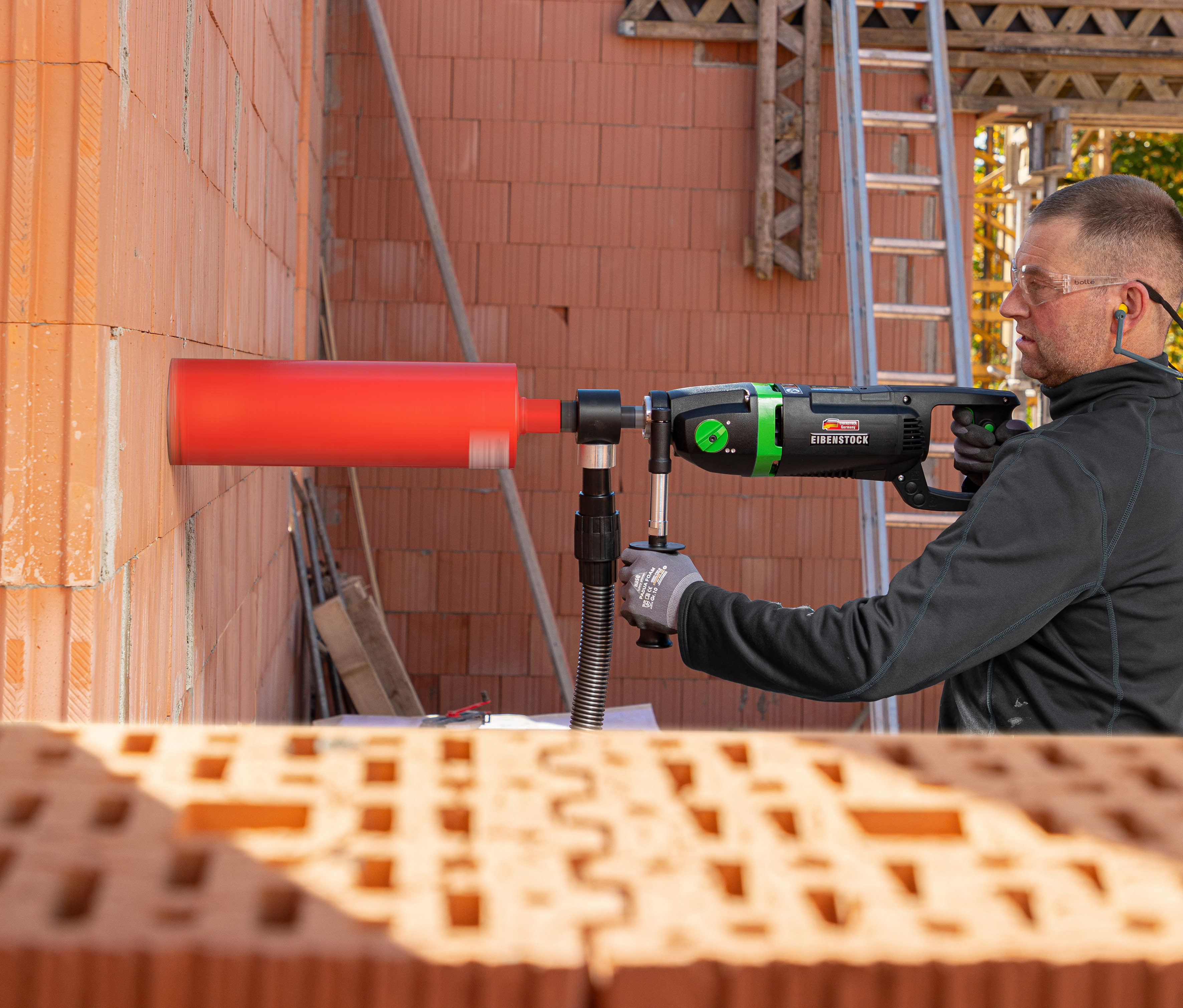 - Trockenbohren bis Ø 132 mm in Kalksandstein, Mauerwerk, Klinker, Ziegel und andere abrasive Materialien