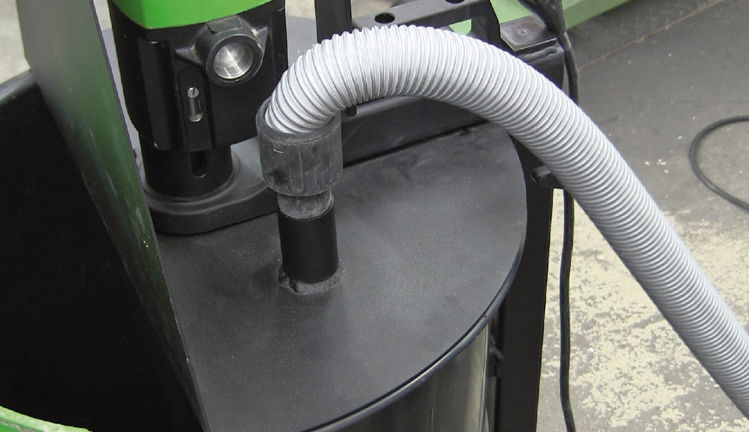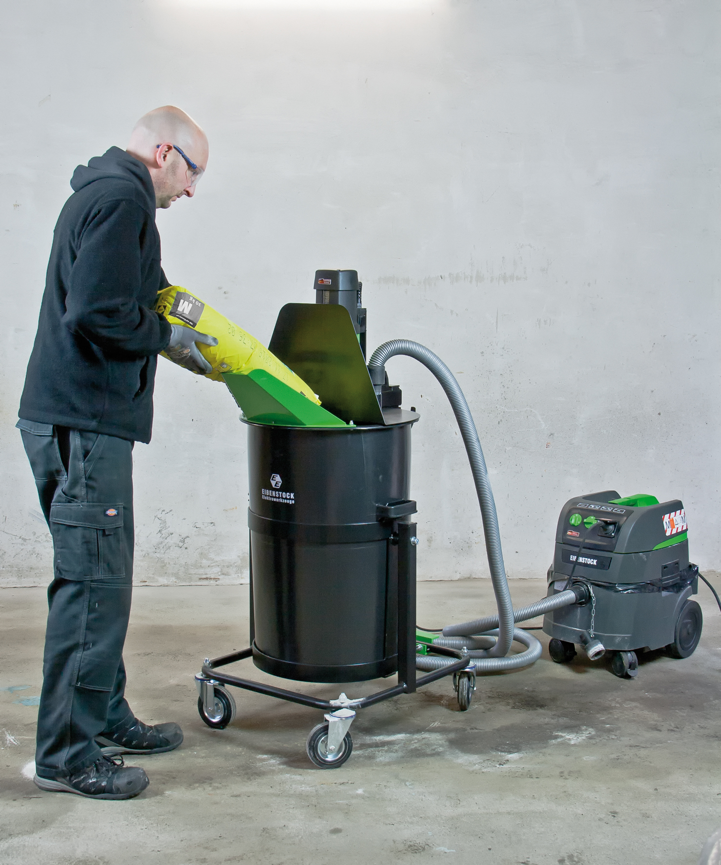 - Anschluss für Staubabsaugung Ø 35 mm – staubarmes Einfüllen und Anmischen der Baustoffe