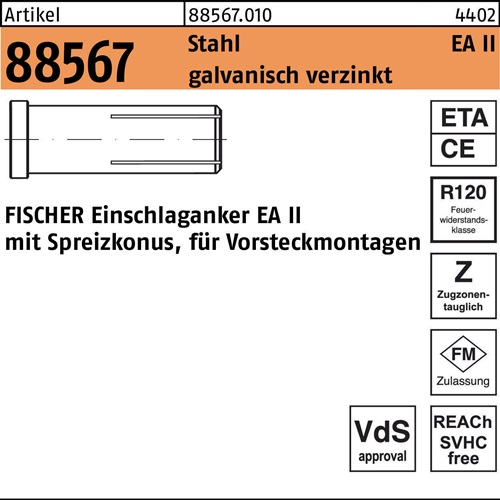 Artikel 88567 Stahl EA II galvanisch verzinkt FISCHER Einschlaganker EA II mit Spreizkonus · für Vorsteckmontagen - Abmessung: EA II M20 x 80 VE=S (10 Stück) Weitere technische Eigenschaften: · Gruppencode: 88567.010 · Norm: REYHER-Artikel 88567 · Oberfläche: galvanisch verzinkt
