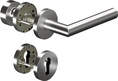 Feuerschutz-Rosetten-Garnitur · DIN links / rechts · Vierkant 9 mm · Drückergarnitur = beidseitig Drücker / Wechselgarnitur = außen Knopf 3020 · für Türstärke 38-63 mm Demontagemöglichkeit der Drückerlochteile bei Verwendung einer handelsüblichen Sicherungsringzange. Optimale Montage durch M5 TORX-Schrauben · Hochhaltefedern einseitig (Durchgangsseite) Lieferung als Komplettgarnitur Weitere technische Eigenschaften: · Lagerung: fest / fest-drehbar · Ergänzung: D/K · Vierkant: 9mm