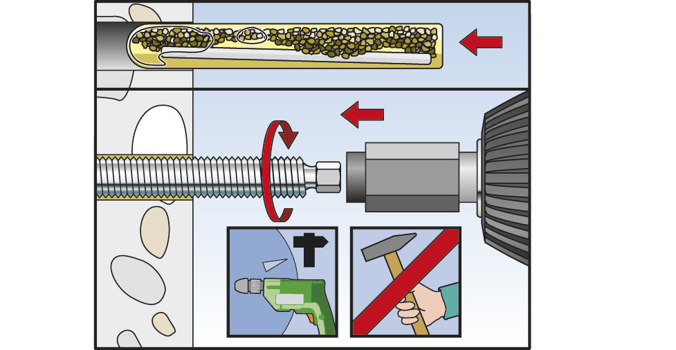 - Bitte beachten Sie die Zulassungen der jeweiligen Reaktionspatronen bzw. Mörtel.