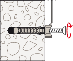 - Der Sockel des Befestigungsbinders FF wird mittels Schraube oder Schraube und Dübel im Untergrund befestigt.