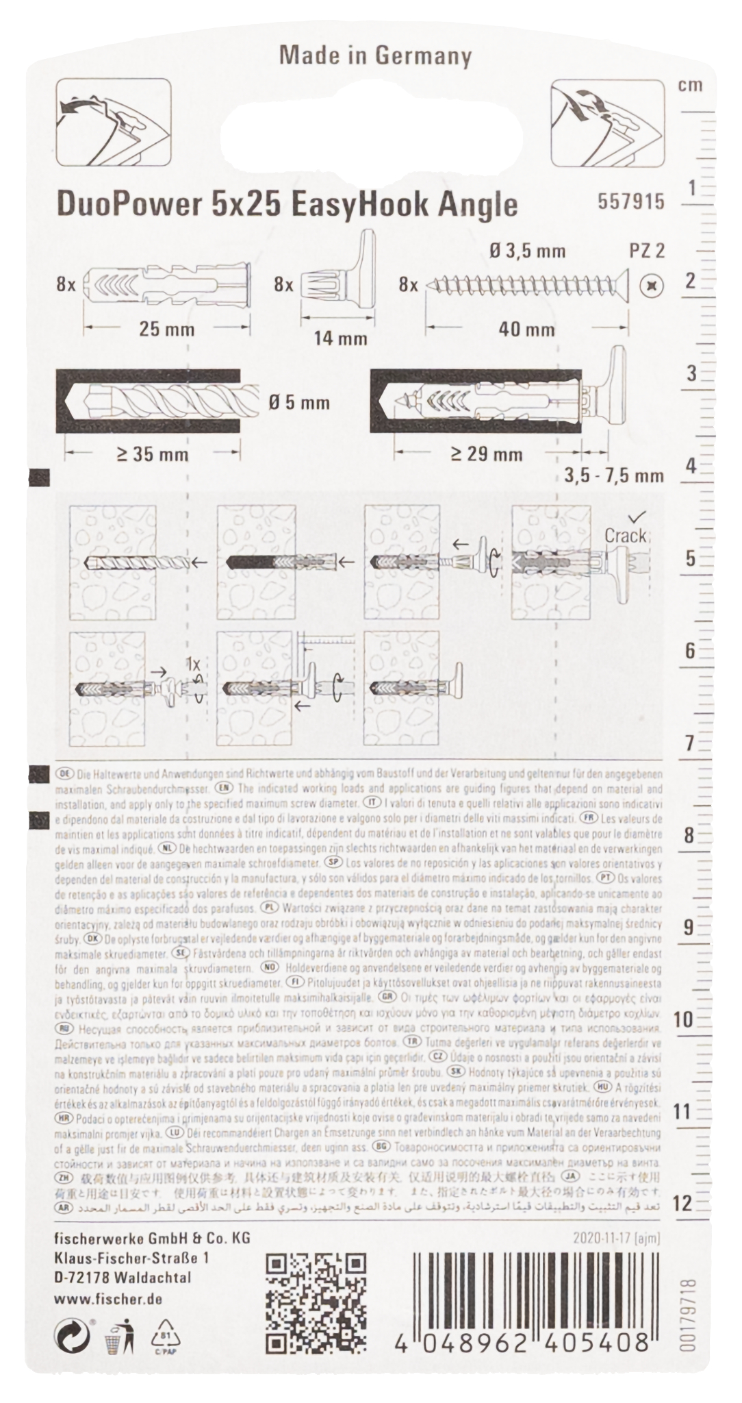 | Inhalt: | 8 x EasyHook Winkelhaken 6 - 8 x Dübelschraube 3,5 x 40 ZPF - 8 x DuoPower 5 x 25 |