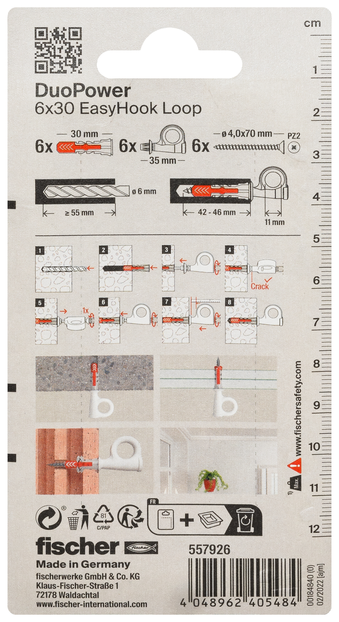 | Inhalt: | 6 x DuoPower 6 x 30 - 6 x Spanplattenschraube 4,0 x 70 - 6 x EasyHook Öse - 6 x Abdeckkappe |