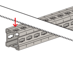 - Die Ausführung des variablen Verbinders FMVB mit Langloch und Rasterung zur Aufnahme der Zahnplatte des Hammerkopf-Steckverbinders FMHB ermöglicht eine optimale Justage des abgestützen Profils für eine einfache und sicher Montage.