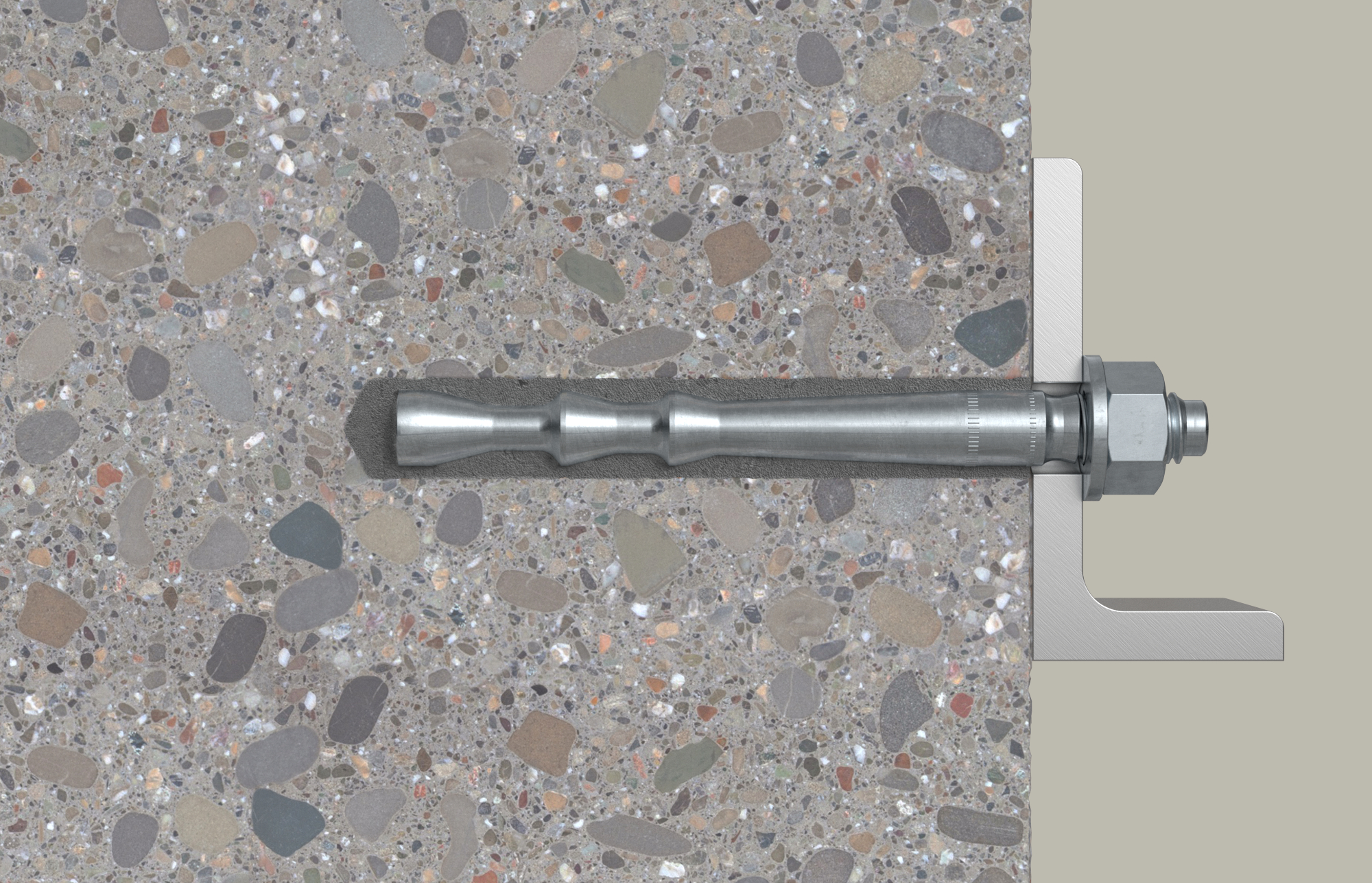- Beim Anziehen der Sechskantmutter werden die Konen der Ankerstange in die Mörtelschale gezogen, die sich gegen die Bohrlochwand verspannt.