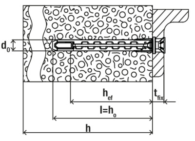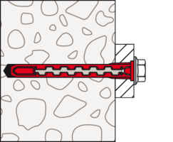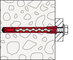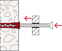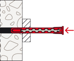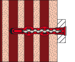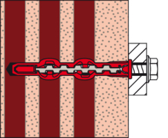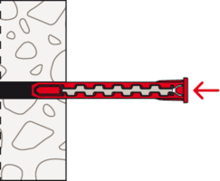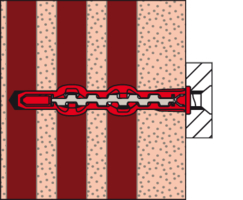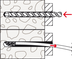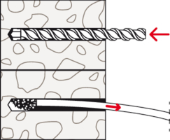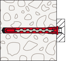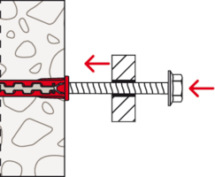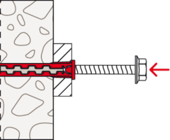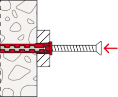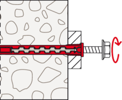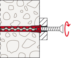 - Der Dübel wird von Hand oder durch leichte Hammerschläge ins Bohrloch gesteckt und verspreizt anschließend durch Eindrehen der Schraube im Baustoff.