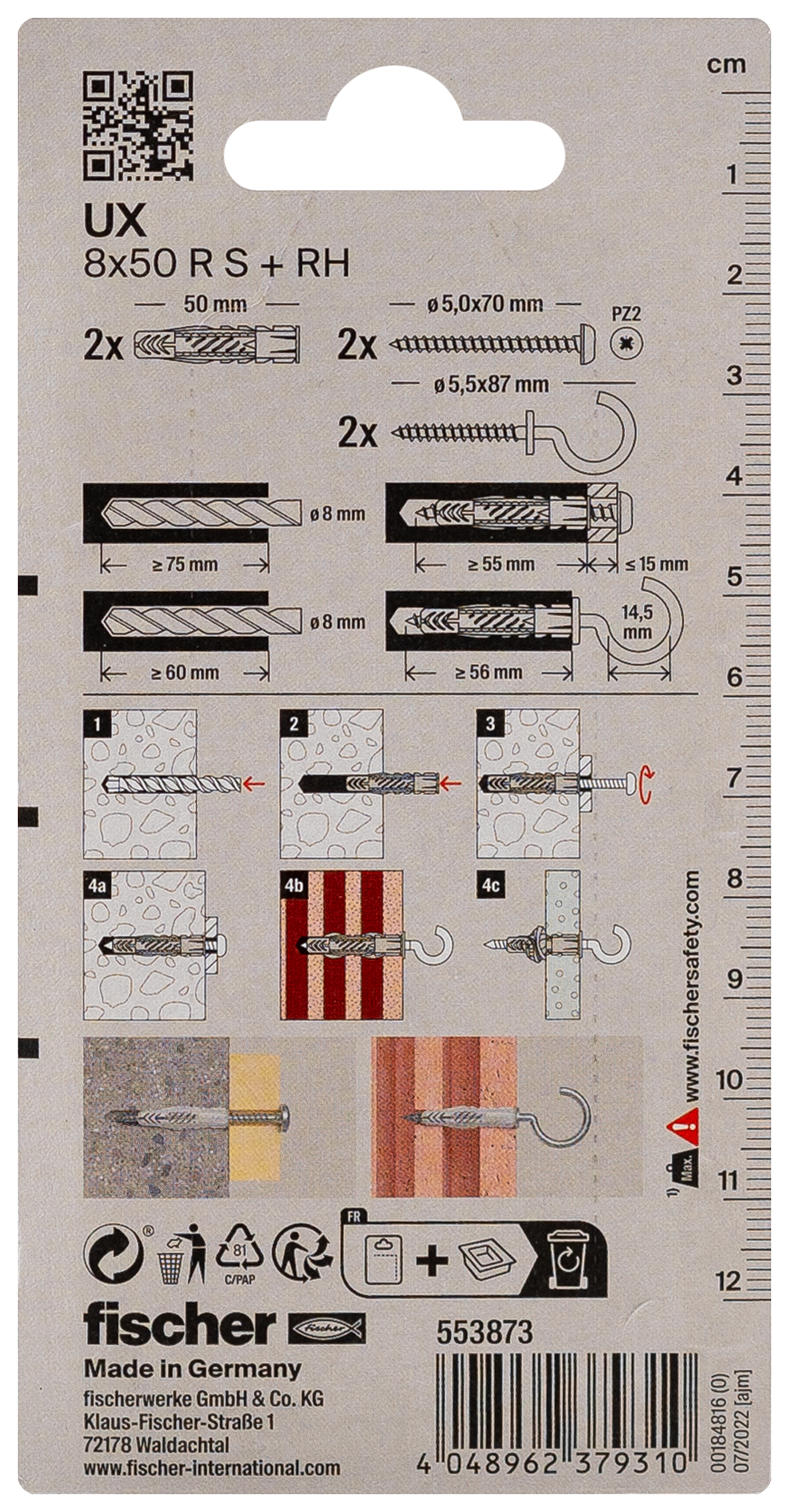 | Inhalt: | 2 x Universaldübel UX 8 x 50 R - 2 x Spanplattenschraube 5,0 x 70 Panhead - 2 x Rundhaken 5,5 x 87 |