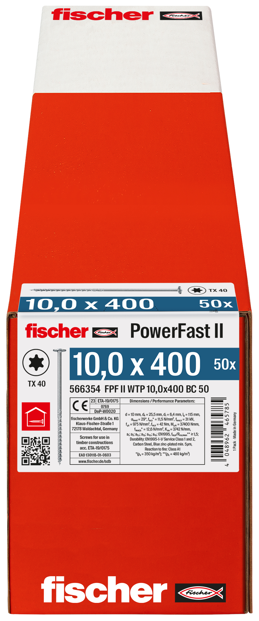 fischer PowerFast FPF II WTP 10,0 x 400 BC 50 Tellerkopf mit Innenstern TX Teilgewinde galvanisch verzinkt blau passiviert