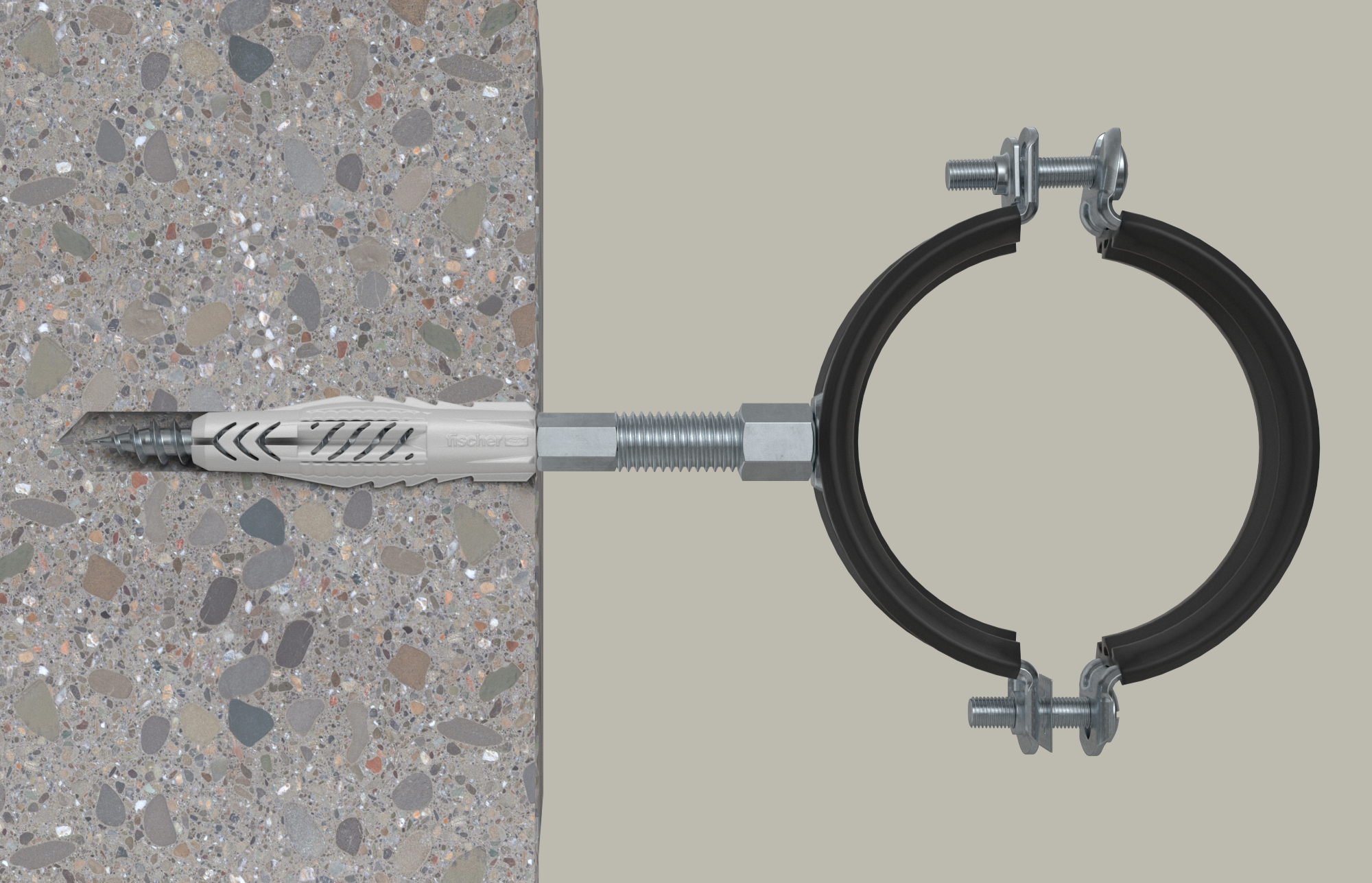 - Stockschraube zur einfachen Befestigung von Rohrschellen direkt an den Untergrund mittels Dübel mit TX-Antrieb.