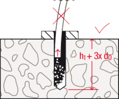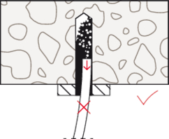 - Bei vertikaler Montage (in Decken und Böden) und der Verwendung von Hohlbohrern ist eine Bohrlochreinigung nicht erforderlich. Bei Bohrungen in den Boden muss 3x Bohrdurchmesser tiefer gebohrt werden.