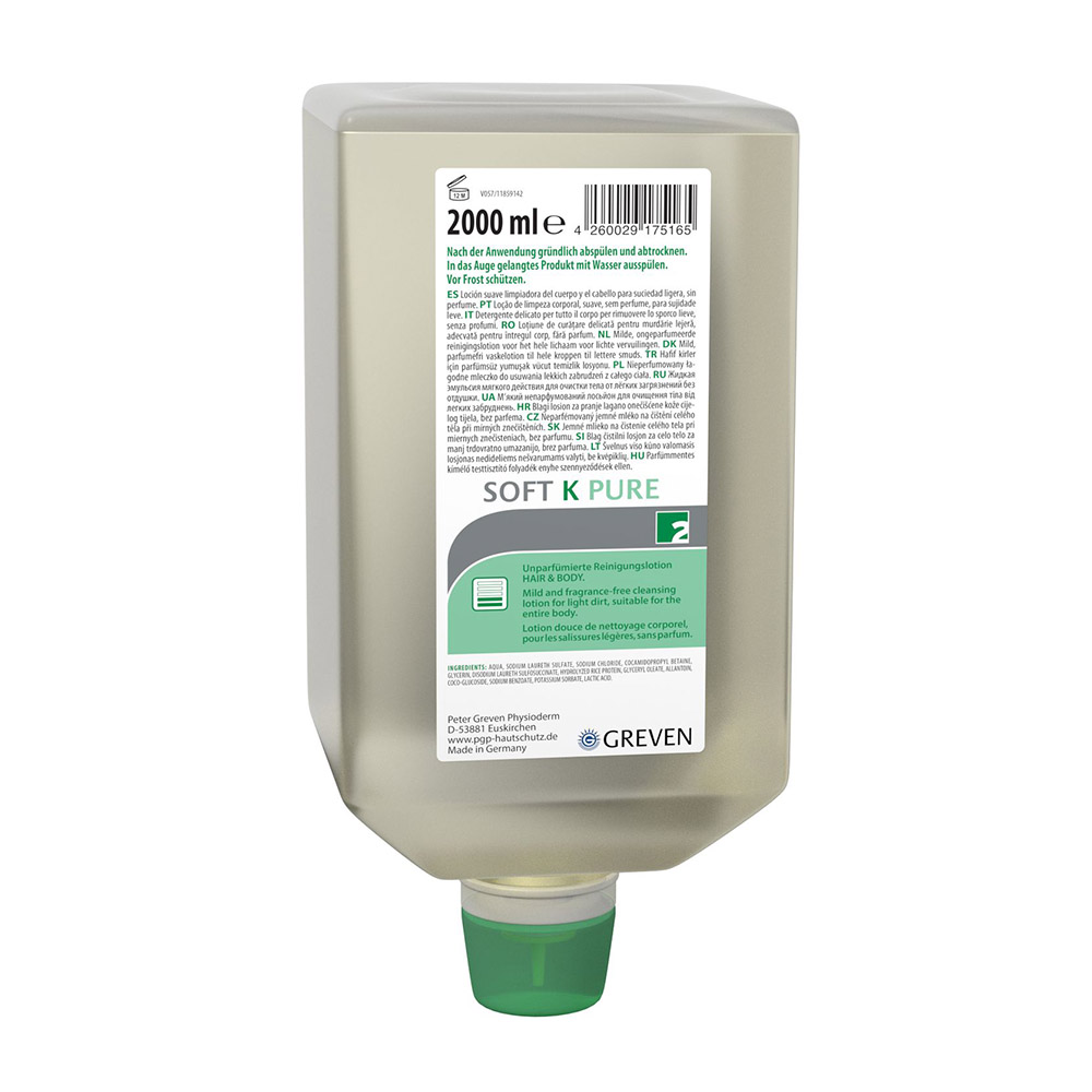 GREVEN Hautreinigungslotion SOFT K in der 2000ml Varioflasche ist eine milde Ganzkörperreinigungslotion, die für schonende und wirkungsvolle Reinigung von Haut und Haaren sorgt. Sie enthält hochwertige Waschrohstoffe, ist rückfettend, dem natürlichen pH-Wert der menschlichen Haut angepasst, seifenfrei und parfümiert. Diese Lotion eignet sich ideal bei leichten bis mittleren Verschmutzungen und ist perfekt als Duschgel für Haut und Haar.