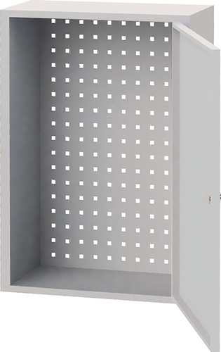 stabile Stahlblechkonstruktion, pulverbeschichtet (Strukturlack) · Tür abschließbar mit Zylinderschloss · Rückwand mit Vierkantlochung 10 x 10 mm, Lochabstand 38 mm Weitere technische Eigenschaften: · Ausführung: Vollblechtüren · Variante: 1