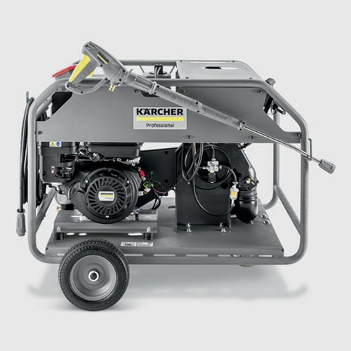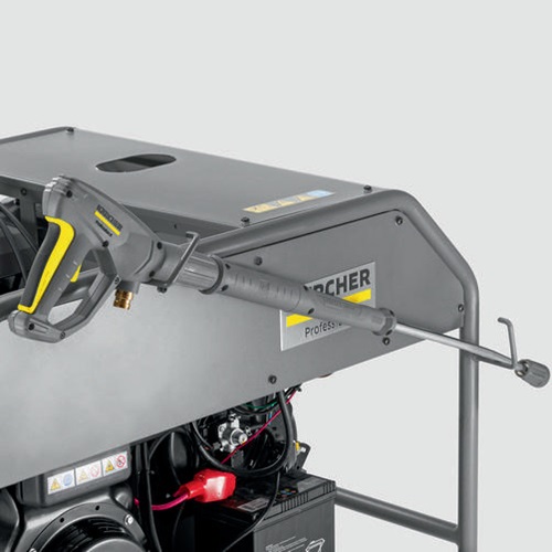 Mit einer Wassermenge von 800 Litern pro Stunde und 200 Bar Arbeitsdruck überzeugt unser Heißwasser-Hochdruckreiniger HDS 8/20 G auch bei anspruchsvollsten Reinigungseinsätzen im Baugewerbe, in Kommunen oder bei Gebäudedienstleistern. Angetrieben von einem leistungsstarken Benzinmotor, der eine externe Stromversorgung überflüssig macht, beseitigt das Gerät auch hartnäckige Verschmutzungen, wie beispielsweise durch Grafitti oder Schmierstoffe. Dafür sorgen die hocheffiziente und langlebige Brennertechnologie genauso wie eine robuste Kurbelwellenpumpe. Ein integrierter 30-Liter-Brennstofftank erlaubt dabei lange Laufzeiten. Zum Schutz aller wichtigen Komponenten ist der HDS 8/20 G mit vielfältiger Sicherheitstechnik, wie je einem Thermo- und Sicherheitsventil, einem großen Wasserfilter, Abgastemperaturüberwachung oder Softdämpfungssystem (SDS), ausgestattet. Hohe Ergonomie, Mobilität, Robustheit und Bedienerfreundlichkeit werden unter anderem durch pannensichere Reifen, eine Lenkrolle mit Feststellbremse, Schubgriffe, einen Ein-Knopf-Wahlschalter und einen stabilen Stahlrohrrahmen gewährleistet. Zubehöre wie Hochdruckschlauch und -lanze sind einfach direkt am Gerät unterzubringen.