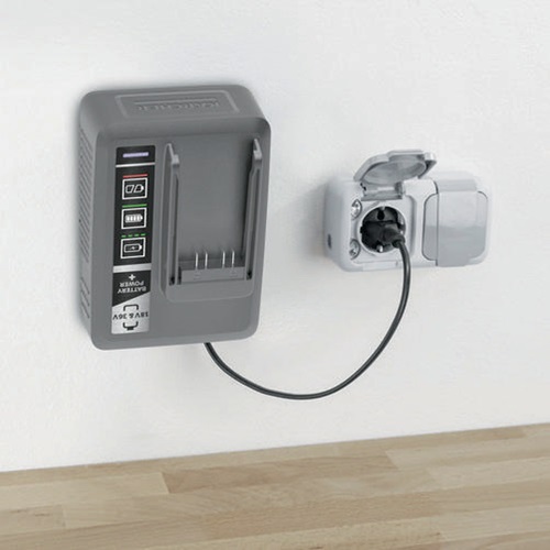 Universalladegerät Battery Power+ mit LED-Betriebszustandsanzeige zum Laden aller 18 und 36 V Kärcher Battery Power- und Kärcher Battery Power+-Lithium-Akkus. Geeignet zur Wandmontage.