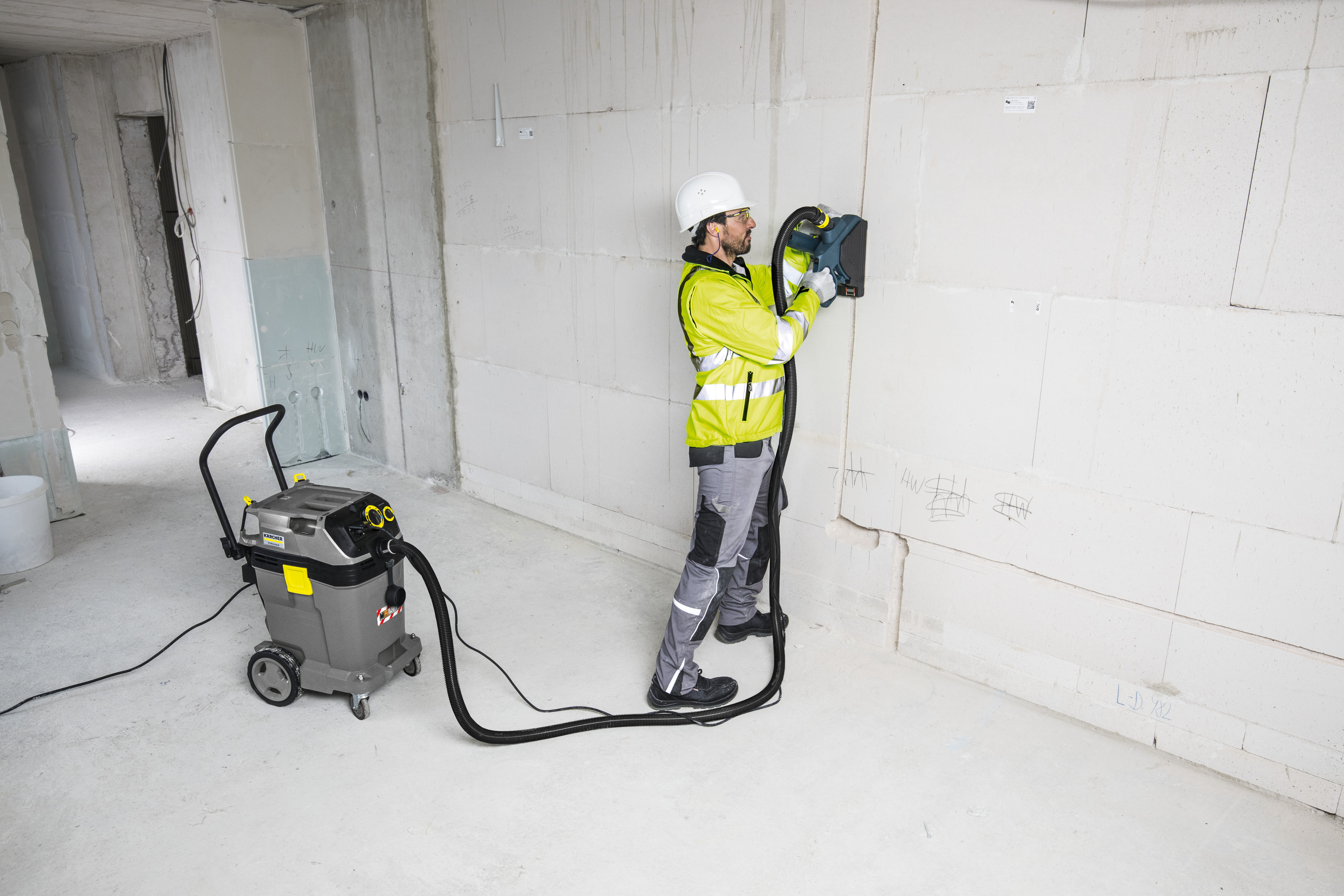 Dank der neuen vollautomatischen Filterabreinigung schafft unser Nass-/Trockensauger 50/1 Tact Te M unerreicht hohe Mengen Feinstaub bei gleichzeitig garantierter Filtrationseffizienz von 99,9 Prozent. Mittels sensorgesteuerter Elektronik sorgt das Gerät immer für eine optimale Filterabreinigung und damit für eine konstant hohe Saugleistung. Im Zusammenspiel mit dem großen und robusten 50-Liter-Behälter mit Metalllenkrollen und verstellbarem Schubbügel meistert das Gerät so auch sehr große Mengen gefährliche Feinstäube der Staubklasse M, aber auch Grobschmutz und Flüssigkeiten. Der NT 50/1 Tact Te M ist mit Gerätesteckdose mit Automatikanlauf sowie dem kompletten Antistatiksystem inklusive leitenden Zubehörs ausgestattet. Er eignet sich daher besonders für die Direktabsaugung an Elektrowerkzeugen, die viel Feinstaub produzieren. Staub, der sich bereits auf dem Boden oder auf Maschinen abgelagert hat, wird sicher mit dem komplett neu entwickelten Zubehörset bestehend aus 4-Meter-Saugschlauch, Edelstahlsaugrohren sowie der breiten Bodendüse aufgenommen. Sämtliche Zubehöre sind dank durchdachter Aufbewahrungslösungen sicher am Gerät verstaut.