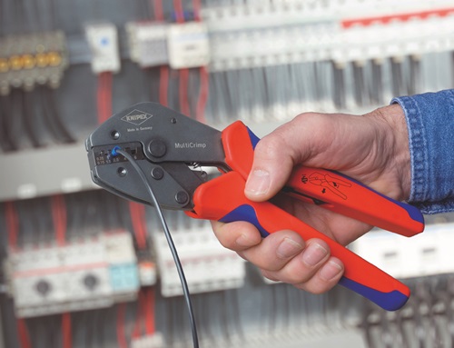für isolierte Kabelverbindungen 0,5 - 6 mm² · mit zusätzlichem Locator zur Gewährleistung einer präzisen Crimpverbindung · 33 % weniger Kraftaufwand · präzise Einstellung der Vorspannung für das Halten einer konstanten Pressleistung · einfaches Handling dank reduzierter Öffnungsweite des Werkzeuges, optimale Ergonomie durch gelenkschonende Position der Handfläche und Finger · die Ader- und Isolationspressung erfolgt in einem Arbeitsgang · 3K-Griff: GELB: harter Kern zur Kraftübertragung, BLAU: softe ergonomische Grifffläche, GRAU: softer Abgleitschutz Weitere technische Eigenschaften: · Gewicht: 0,53kg