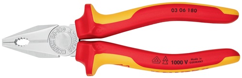 VDE-isoliert bis 1000 V · gefertigt gem. DIN EN/IEC 60900, stückgeprüft · Greifzonen für Flach- und Rundmaterial · lange Schneiden für dickere Kabel · Schneiden zusätzlich induktiv gehärtet, Schneidenhärte ca. 60 HRC · Spezial-Werkzeugstahl, geschmiedet, mehrstufig ölgehärtetZange verchromt