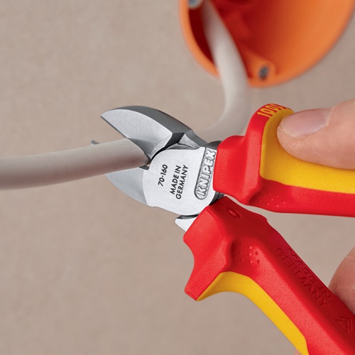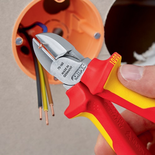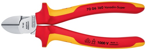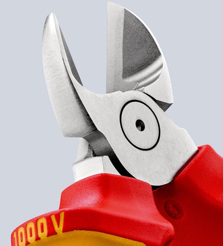 VDE-isoliert bis 1000 V · gefertigt gem. DIN EN/IEC 60900, stückgeprüft · schlanke Kopfform · sauberer Schnitt bei dünnen Cu-Drähten, auch an den Schneidenspitzen · Schneiden zusätzlich gehärtet, Schneidenhärte ca. 62 HRC · Vanadin-Elektrostahl, geschmiedet, mehrstufig ölgehärtetZange verchromt