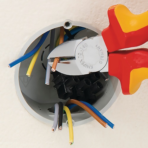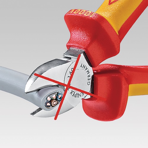 VDE-isoliert bis 1000 V · gefertigt gem. DIN EN/IEC 60900, stückgeprüft · Greifzonen für Flach- und Rundmaterial · lange Schneiden für dickere Kabel · Schneiden zusätzlich induktiv gehärtet, Schneidenhärte ca. 60 HRC · Spezial-Werkzeugstahl, geschmiedet, mehrstufig ölgehärtet Zange verchromt mit integrierter isolierter Befestigungsöse zum Anbringen einer Absturzsicherung Weitere technische Eigenschaften: · Zange: verchromt