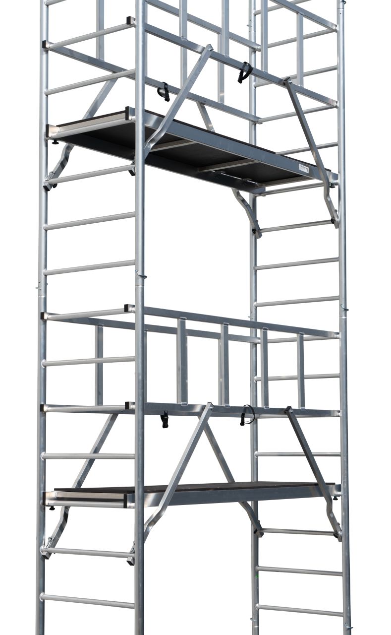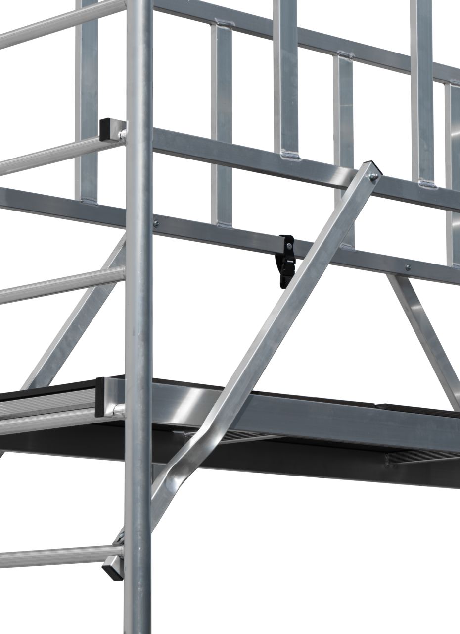 Einfacher und sicherer Gerüstaufbau durch die Befestigung vor dem Einhängen der nächsthöheren Belagbühne