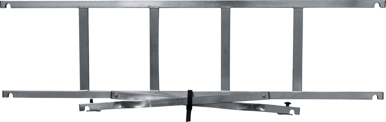 Für Transport oder Lagerung kann der Geländerrahmen platzsparend zusammengefaltet und mit einem Gurtband fixiert werden