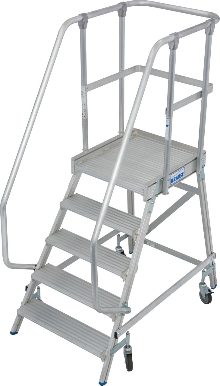 Fahrbare Plattformtreppe aus Aluminium mit Neigung 60° Stufen- und Plattformbreite: 600 mm Plattformlänge: 460 mm Letzte Stufe (Tiefe: 225 mm) auf gleicher Höhe wie Plattform montiert (Gesamttrittfläche: 685 mm) Stufen- und Plattformausführung standardmäßig in Aluminium geriffelt (R 9) · optional auch mit anderen Belägen erhältlich Handlauf beidseitig und 3-seitiges Plattformgeländer Ø 40 mm mit verschraubten Verbindungselementen serienmäßig (Geländerhöhe: 1.100 mm) Zwei Lenkrollen Ø 100 mm am Steigteil und zwei Bockrollen Ø 125 mm als Querfahrwerk am Stützteil garantieren ein einfaches Verfahren von Ort zu Ort · die integrierten Feststeller (Totalstop) sorgen für einen sicheren Stand Einfache Montage durch Lieferung in vormontierten Baugruppen inklusive Montageanleitung Maximale Belastung: 1,5 kN/m2 · Stufenbelastung 150 kg · Gesamtbelastung 300 kg Hinweis: Im Standard sind Verbindungsteile aus verzinktem Stahl enthalten · welche für den Innenbereich geeignet sind. Gegen Mehrpreis können diese auch in Edelstahl ausgeführt werden · was für den Außenbereich empfohlen wird