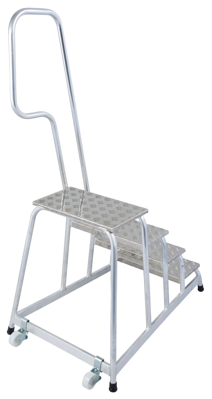 Der verfahrbare und leichte Aluminium-Montagetritt für anspruchsvolle industrielle Anwendungen mit rutschhemmenden Stufen und Aufstiegsbügel.