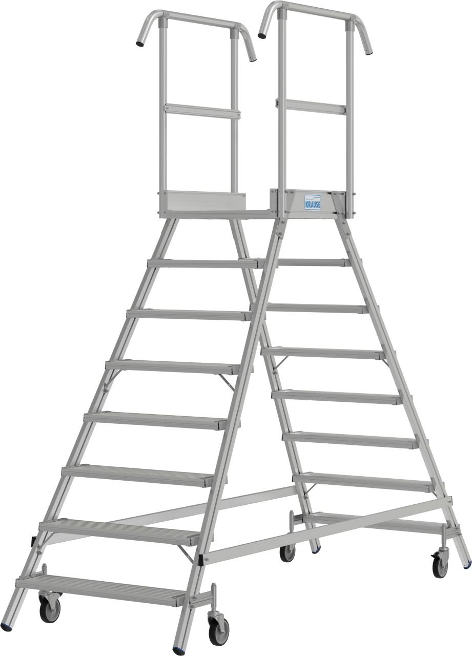 Fahrbare, beidseitig begehbare Aluminium-Podestleiter mit tiefen Stufen und großer Standplattform für sicheres und bequemes Arbeiten. + Fahrbare Alu-Podestleiter, beidseitig begehbar, mit 175 mm tiefen rutschhemmenden Stufen und großer Standplattform incl. Plattformgeländer für sicheres und bequemes Arbeiten. + Geringe Standbreite, ideal für regalnahes Arbeiten + Plattformgröße 600 x 700 mm, Aluminium gerieft + Beidseitiges Plattformgeländer, 1,0 m hoch, 40 mm Durchmesser mit integrierter verstärkter Knieleiste + KRAUSE Connect-System für stabile Handlauf-Befestigung ohne störende Kupplung + Stufenloser Übergang vom Plattformgeländer in die separat erhältlichen Treppenhandläufe - kein Umfassen von Treppenhandlauf zu Plattformgeländer-Handlauf und umgekehrt erforderlich + 100 mm hohe Fußleiste für erhöhte Sicherheit (100 % höher als von der Norm EN 131-7 gefordert) + Vier bei Belastung arretierende Lenkrollen Ø 125 mm, davon zwei mit Feststellbremsen, gewährleisten leichtes Verschieben und verhindern ungewolltes Wegrollen beim Betreten der Treppe + Lieferung in vormontierten Baugruppen für einen leichten schnellen Aufbau + Optional mit selbstschließenden Sicherheitstüren (Art.-No. 821492) ausrüstbar + Ab einer Podesthöhe von 1,00 m sind nach DIN EN 131-7 beidseitig Handläufe erforderlich. Handläufe sind als erforderliches Zubehör zu bestellen