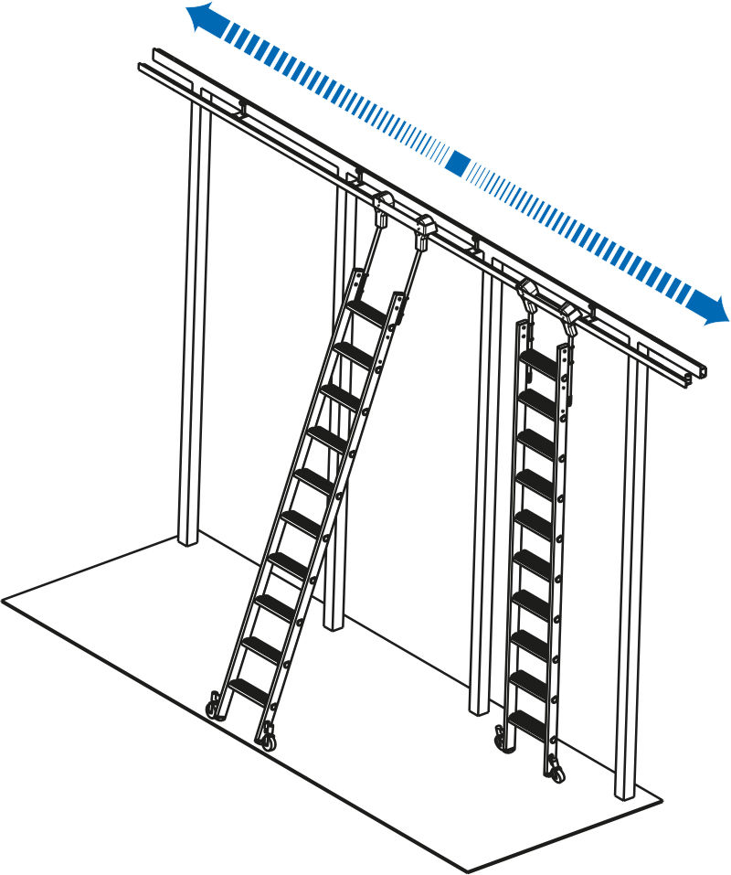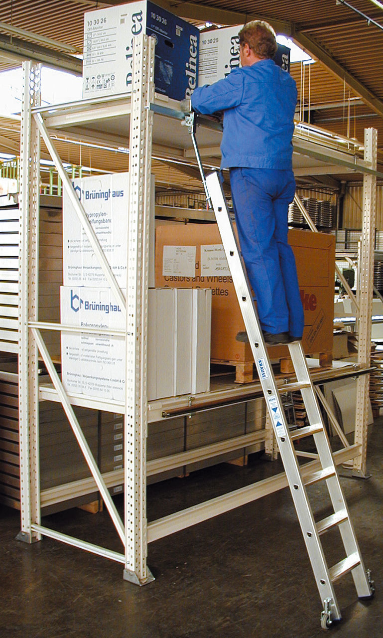+ Leiterneigung 21° und in der Parkposition senkrecht am Regal platzsparend abstellbar