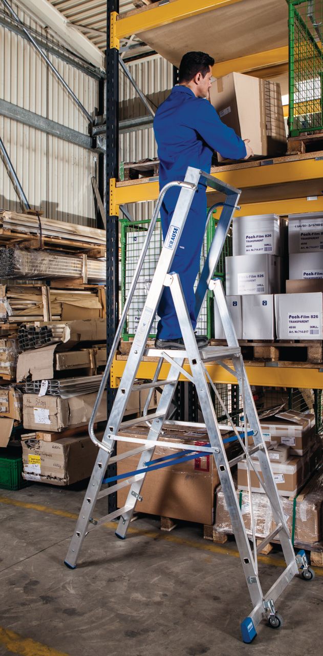 Fahrbare Stufen-Plattformleiter mit großer, komfortabler Standfläche und Sicherheitsbügel.