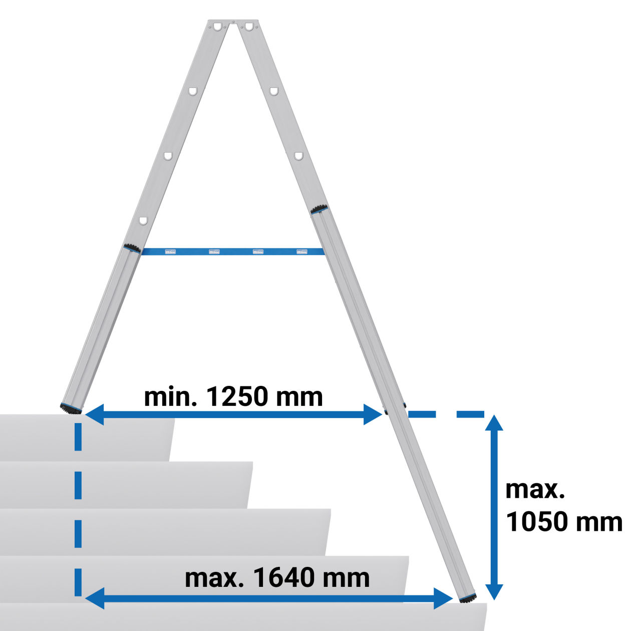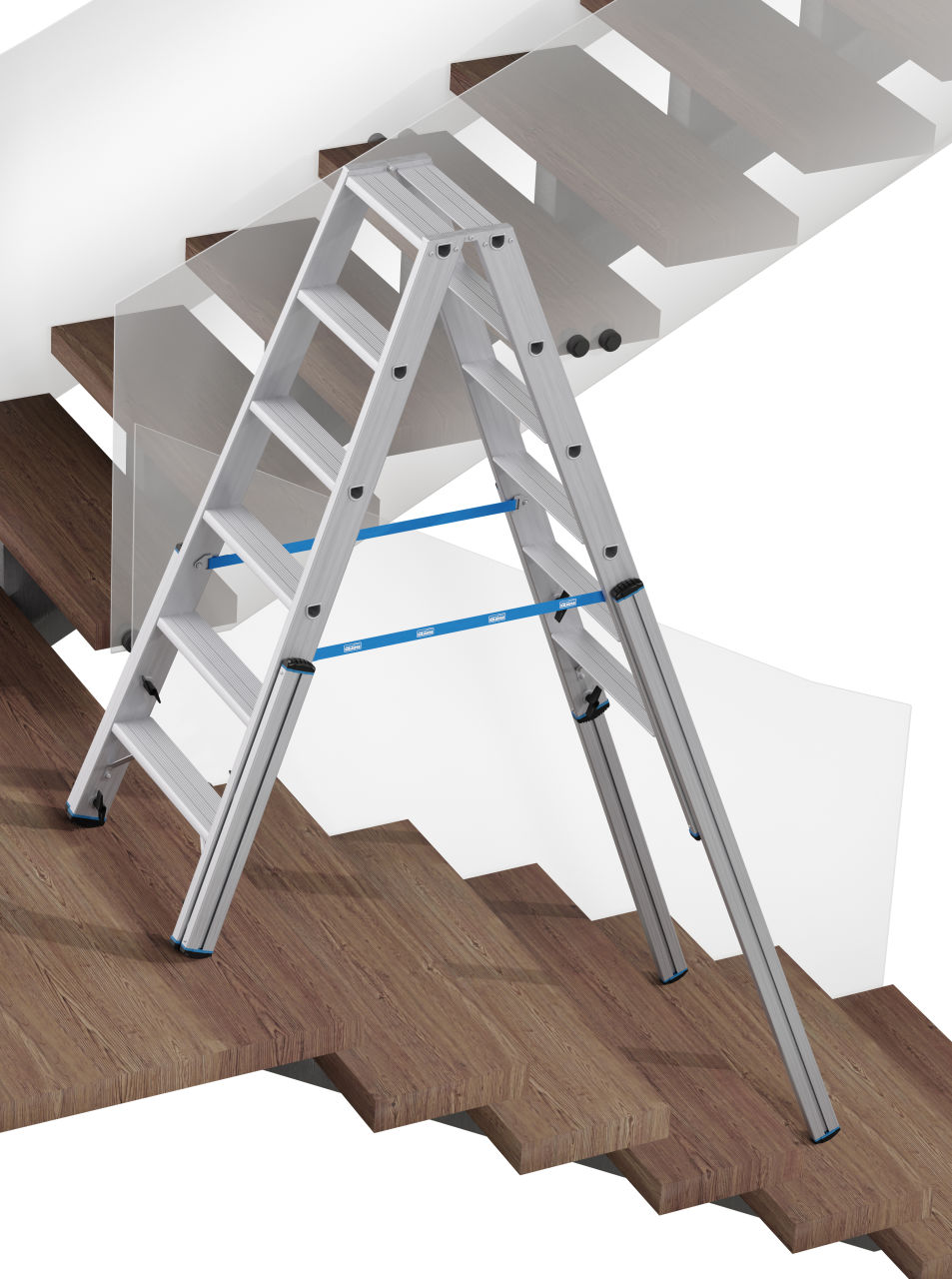 Entwickelt für professionelle Einsatzzwecke, bietet diese Aluminium-Teleskop-Doppelleiter mit Treppenfunktion hohe Standsicherheit, auch im Einsatz auf Treppen, Absätzen, Podesten und ähnlichen Höhenunterschieden.