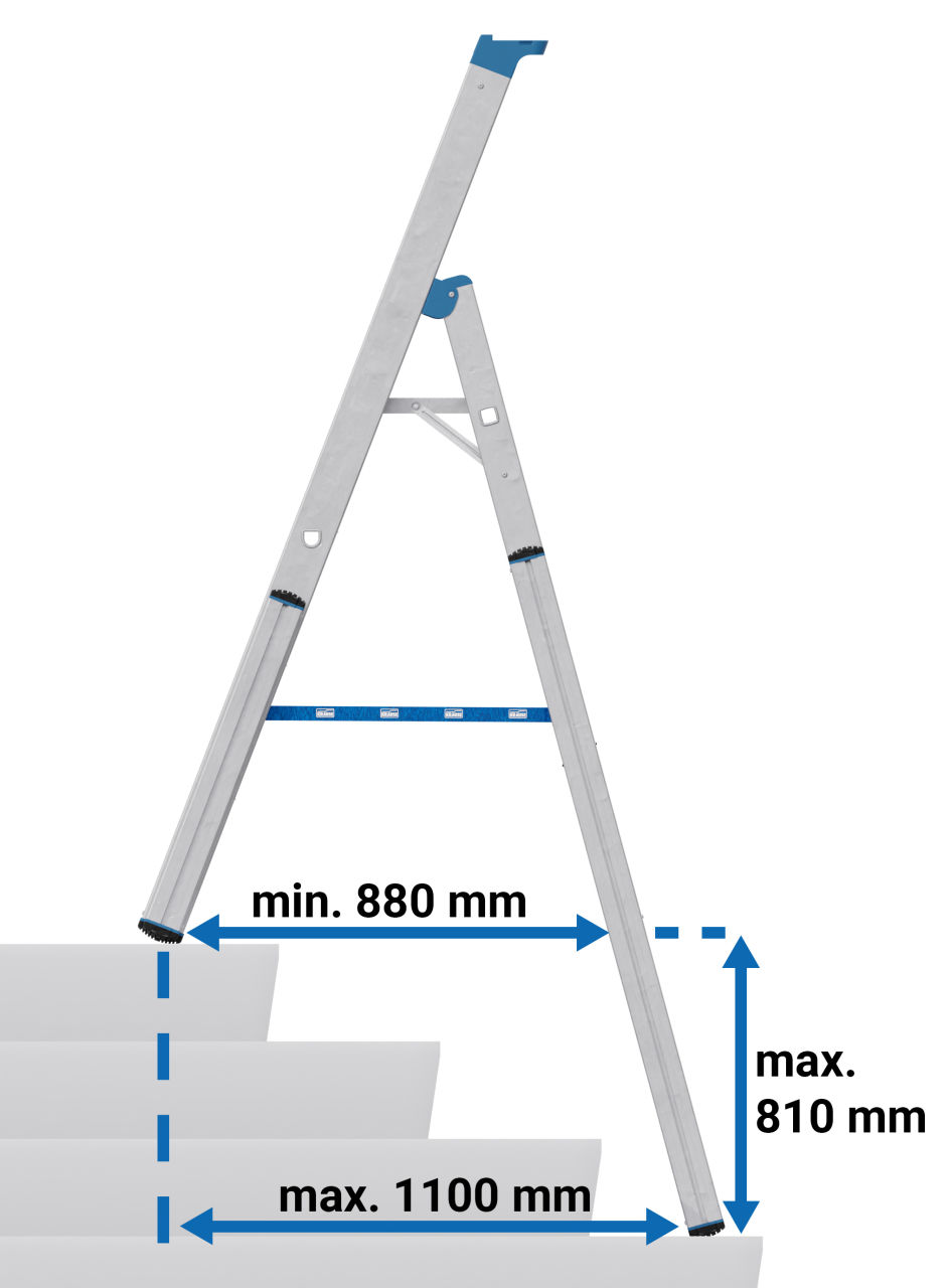 + Profilierte, verstärkte D-Stufen, 80 mm tief, für sicheren Aufstieg und bequemen Stand, erfüllen die Anforderungen der TRBS 2121-2 für die Nutzung von Stufen als Arbeitspl