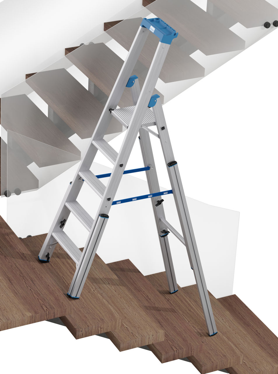 Die robuste, einseitig begehbare Aluminium-Teleskop-Stehleiter mit 4 Holmverlängerungen für den professionellen Einsatz auf Treppen, Absätzen, Podesten und ähnlichen Höhenunterschieden.
