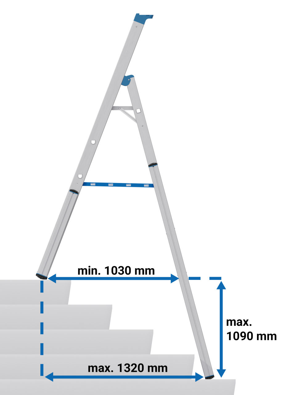 + Profilierte, verstärkte D-Stufen, 80 mm tief, für sicheren Aufstieg und bequemen Stand, erfüllen die Anforderungen der TRBS 2121-2 für die Nutzung von Stufen als Arbeitspl