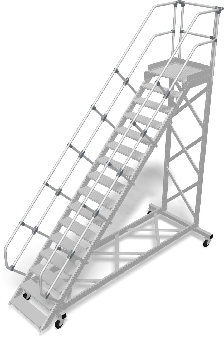 Robuste fahrbare Aluminium-Treppe, das sichere und mobile Arbeitsmittel für alle Arbeitsbereiche in Anlehnung an die DIN EN ISO 14122.