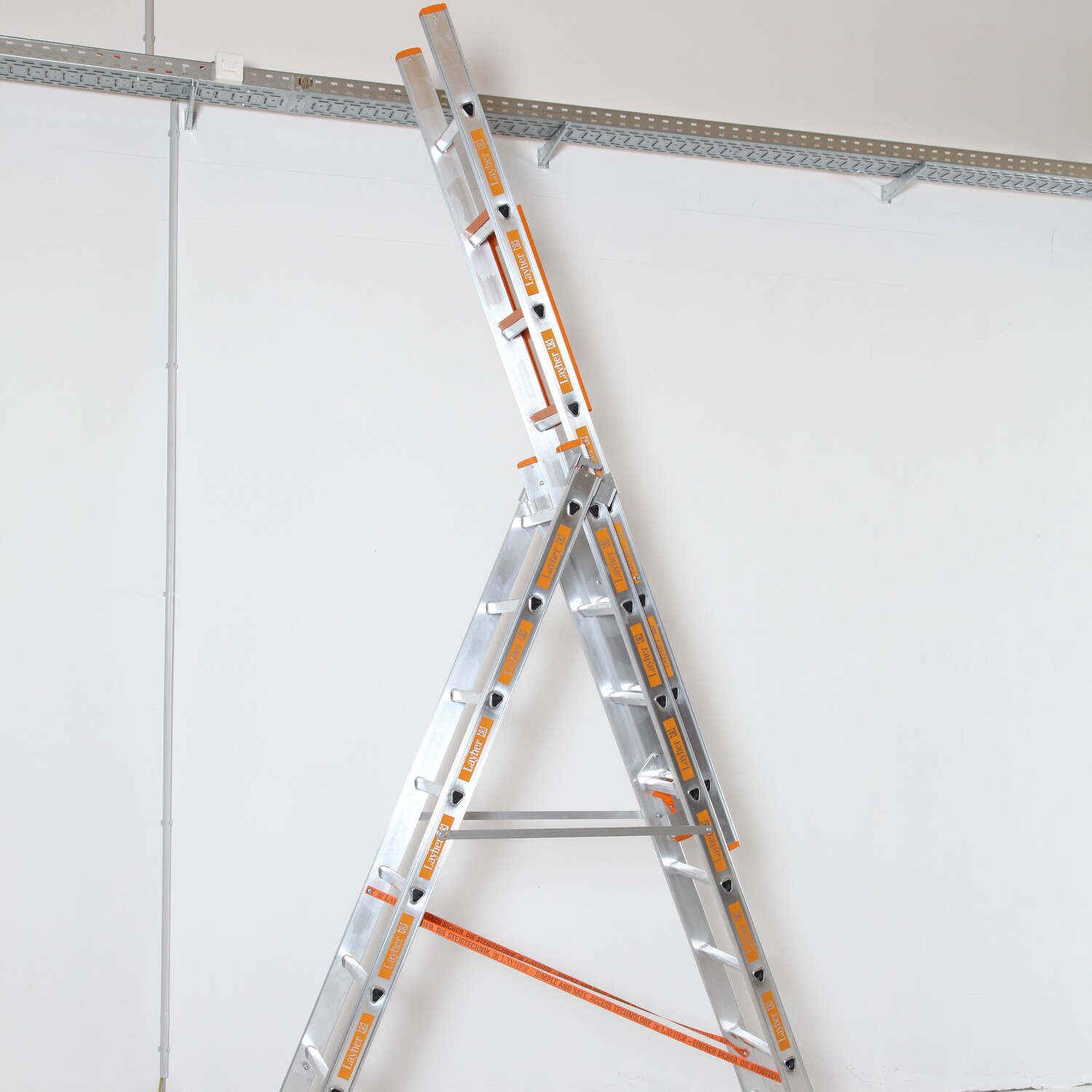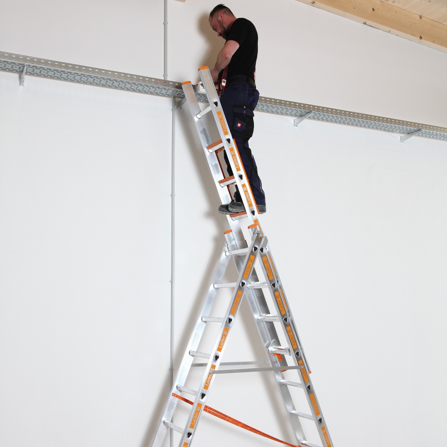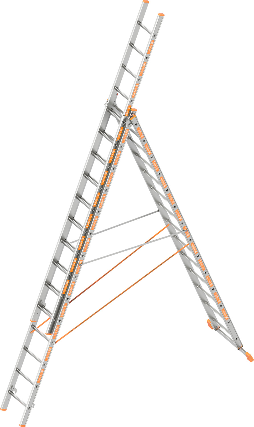 Dreiteilige Aluminium-VielzweckLeiter für professionelle Ansprüche,einsetzbar als Anlege-, Schiebe- und Stehleiter mit ausschiebbarem und einzeln herausnehmbarem Leiternteil.+ Stabile, holmumgreifende Aluminium-Führungsprofile für eine hoheStabilität+ Hohe Standsicherheit durch integrierte Zug-Drucksicherungen+ Holme aus Alu-Pressprofil mit zusätzlicher Kantenverstärkung+ Automatisch einrastende Sperrhebel (AutoSnap-System)+ Extra breite Quertraverse für sicheren Stand+ Rutschhemmende, rundum profilierte, 30 mm tiefe Sprossen+ Wandlaufrollen ab Ausführung 3x12 Sprossen im Lieferumfang enthalten+ Rutschhemmende Fußkappen und -stopfen (SafetyCap)+ Ab 3x12 Sprossen inkl. Trigon-Traverse zur Einzelnutzung der Leiternteile
