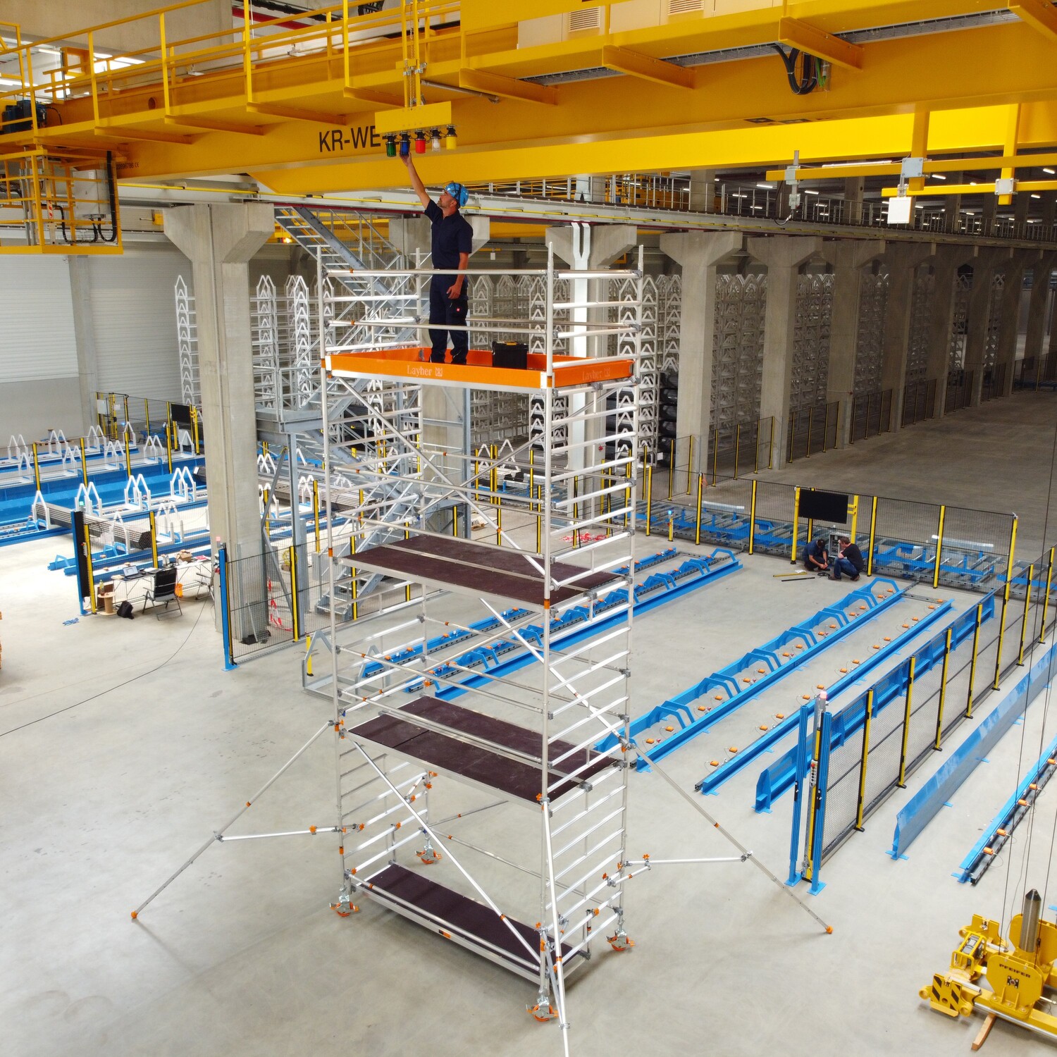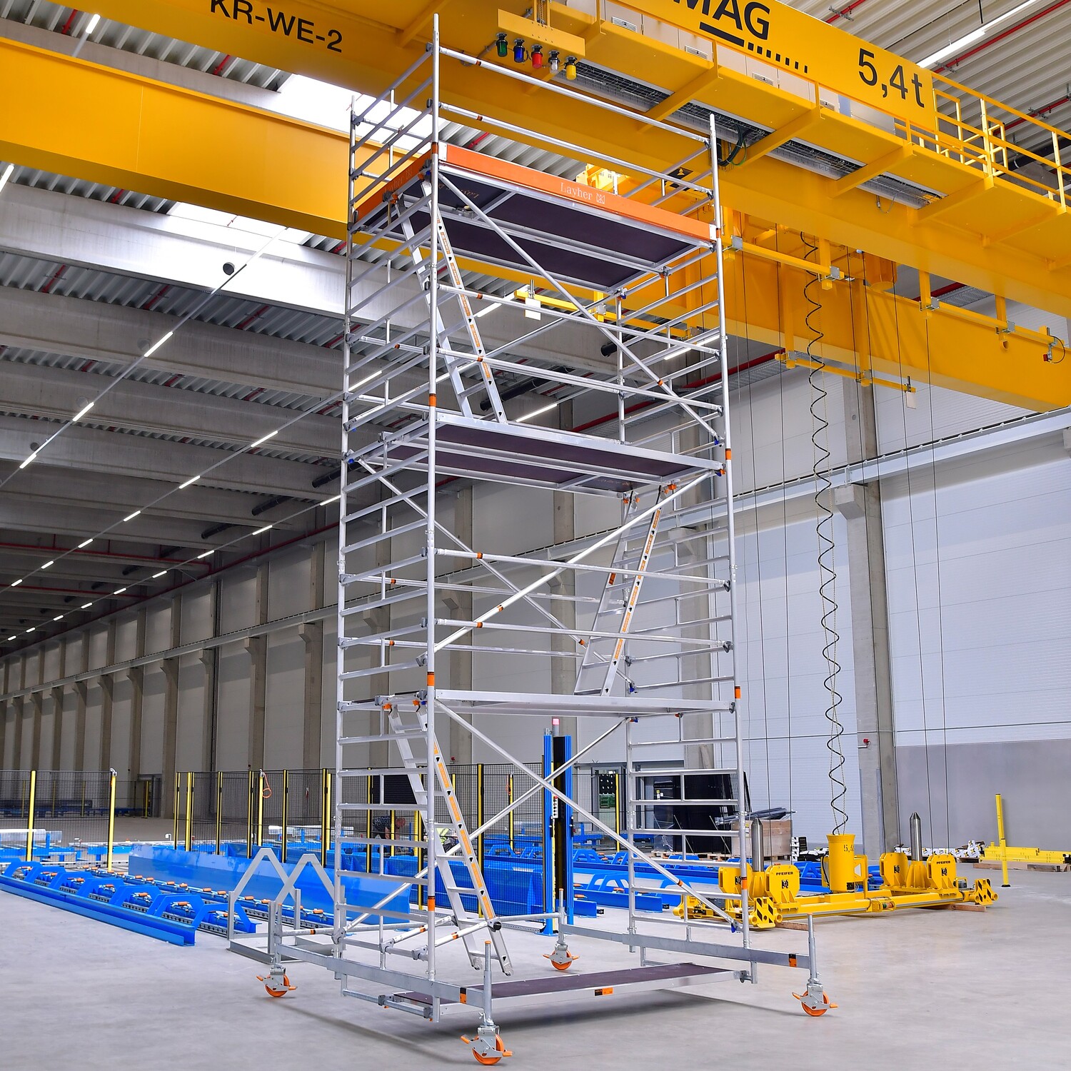 Das Universalgerüst Uni Breit mit dem doppelt breiten Arbeitsboden ist der bequeme Arbeitsplatz in der Höhe. Interessant für Arbeiten mit sperrigem Material und dazu notwendiger Bewegungsfreiheit. Standleitern (1,50 m breit) aus Aluminium für Steckmontage, Geländer und Diagonalen aus Aluminium sind einfach einzurasten. Arbeitsböden aus Aluminium-Rahmen und Sperrholz-Einlage als Durchstieg für gefahrlosen Innenaufstieg. Robuste Lenkrollen mit zentrischer Lasteinleitung nach Arretierung für besondere Standfestigkeit sowie Stahlspindeln zum Niveauausgleich. Basisverbreiterung: mit Fahrbalken aus Stahl, teleskopierbar für wahlweises Arbeiten an Decke oder Wand, erst ab 8,60 m Arbeitshöhe notwendig.;Gerüststützen aus Aluminium, als Basisverbreiterung erlauben je nach Ausrichtung das Arbeiten an Decke oder Wand und reduzieren die Ballastierung.;Der Sicherheitsaufbau P2 realisiert die kollektive Schutzmaßnahme und entspricht somit den Anforderungen der aktuellen Fassung der DIN EN 1004 sowie den geltenden europäischen Arbeitsschutzgesetzen in vollem Umfang.