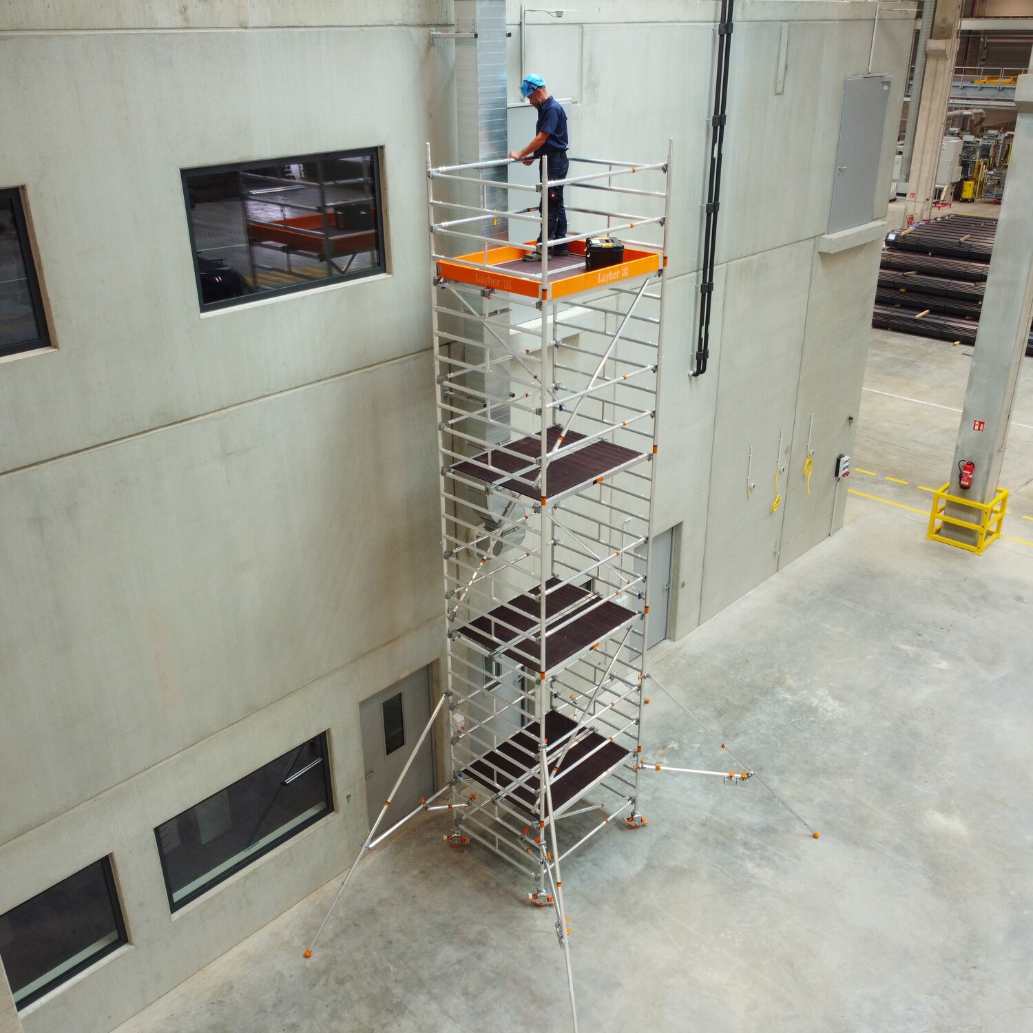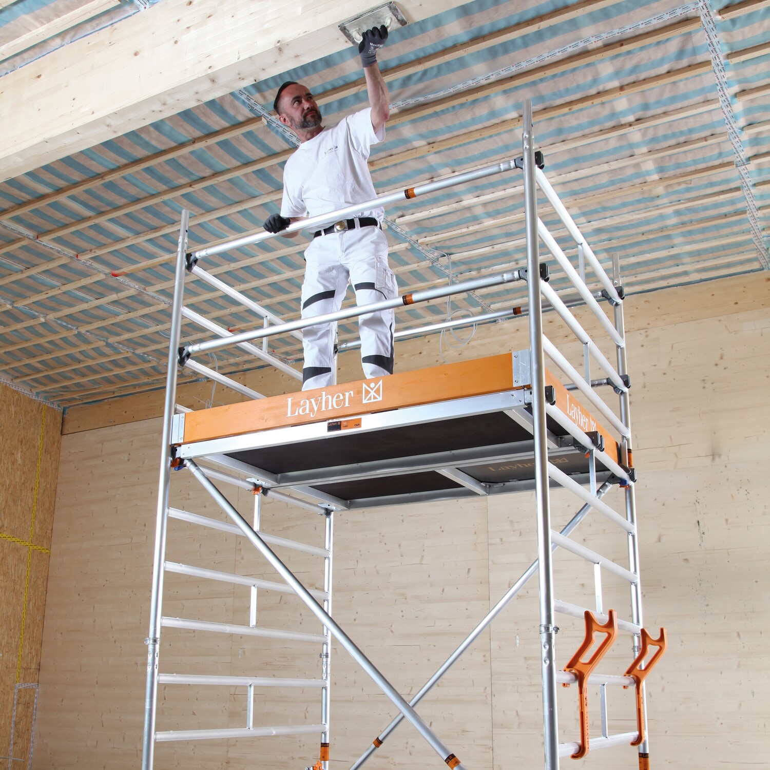 Das Universalgerüst Uni Kompakt mit dem doppelt breiten Arbeitsboden und dennoch kompakten Grundmaßen – bietet ausreichenden Arbeitsplatz in der Höhe auch für Arbeiten mit Material und dennoch üppiger Bewegungsfreiheit. Standleitern (1,50 m breit) aus Aluminium für Steckmontage, Geländer und Diagonalen aus Aluminium sind einfach einzurasten. Arbeitsböden aus Aluminium-Rahmen und Sperrholz-Einlage als Durchstieg für gefahrlosen Innenaufstieg. Robuste Lenkrollen mit zentrischer Lasteinleitung nach Arretierung für besondere Standfestigkeit sowie Stahlspindeln zum Niveauausgleich. Basisverbreiterung: mit Fahrbalken aus Stahl, teleskopierbar für wahlweises Arbeiten an Decke oder Wand, erst ab 8,38 m Arbeitshöhe notwendig. Dank der Gerüststützen kann die Ballastierung reduziert werden.;Der Sicherheitsaufbau P2 realisiert die kollektive Schutzmaßnahme und entspricht somit den Anforderungen der aktuellen Fassung der DIN EN 1004 sowie den geltenden europäischen Arbeitsschutzgesetzen in vollem Umfang.