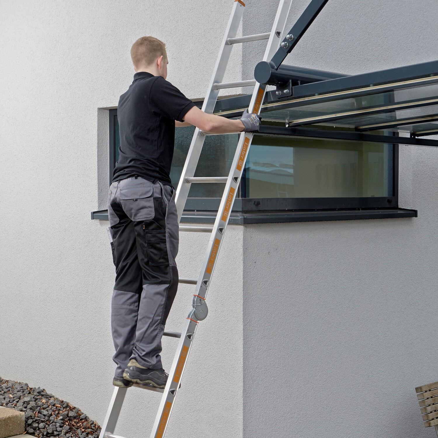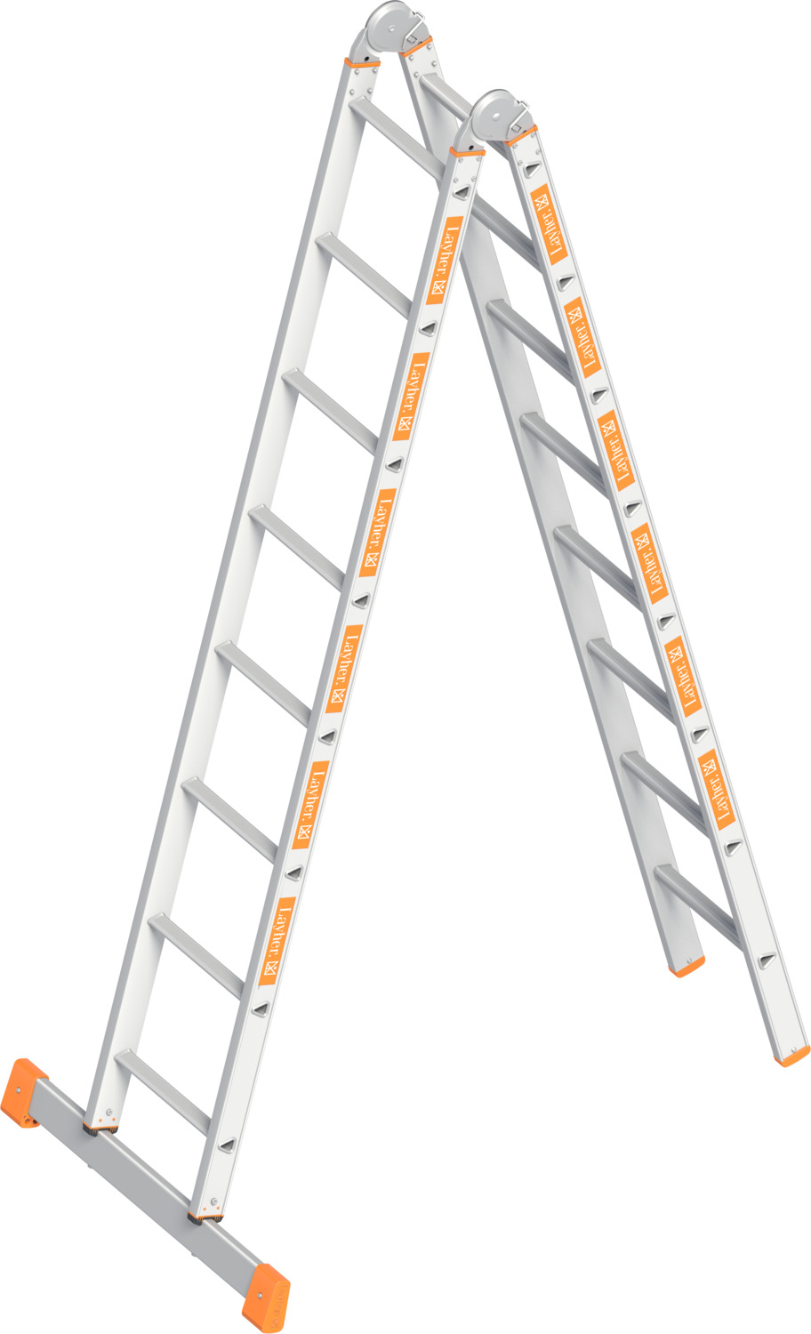 Wahlweise als Schiebeleiter, Anlegeleiter, Stehleiter oder verlängerbare Stehleiter – alles möglich durch Spezialgelenke. Sicherer freistehender Stand der Leiter durch Traverse. Aluminiumaussteifer mit Druckknopfarretierung verhindern ein versehentliches Lösen, können aber per Knopfdruck einfach entriegelt werden. Auch die Montage erfolgt in wenigen Sekunden. Sprossenweise manuelle Höhenverstellung durch Aufsetzhaken. Sicherung gegen Ausheben und Ausschieben. Bequeme Handhabung in allen Einsatzvarianten. Sicherungsklappen verhindern beim Tragen ein seitliches Verschieben der Leiternteile.