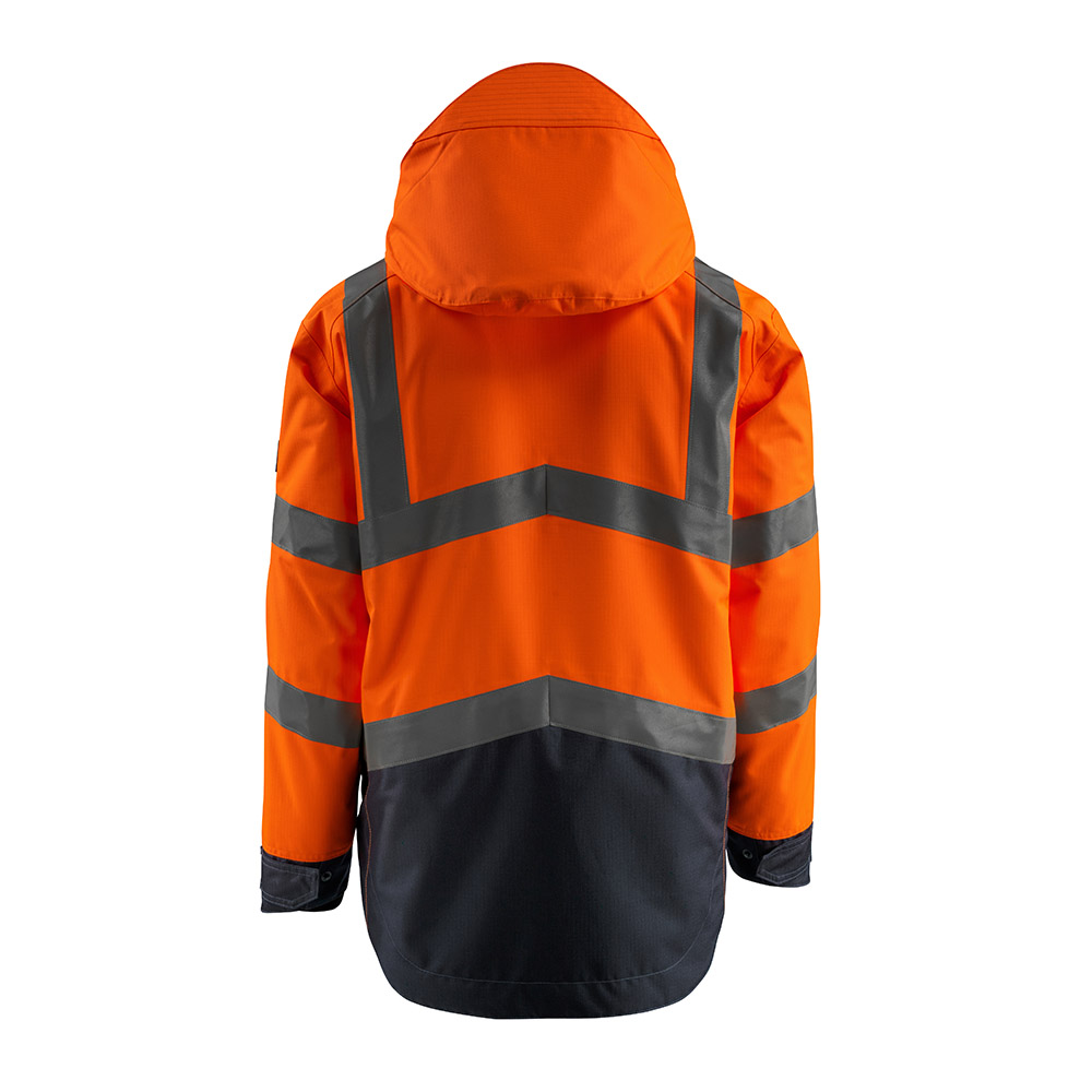 Atmungsaktive, wind- und wasserdichte Warnschutz-Regenjacke, Polyester-Gewebe (Plattbindung) mit PU-Beschichtung, 155 g/m². Futter: Mesh im Körper und Polyamid in den Ärmeln. Feste Kapuze, Reißverschluss unter Druckknopfpatte, 2 aufgesetzte Taschen mit Patte, rund eingesetzte Ärmel, Ärmelverengung mittels Druckknöpfen, Unterarmbelüftung, bandverschweißte Nähte, Rückenlänge 85 cm (L). Farbe: orange. Norm: EN 20471 (3/2), EN 343 (3/3).
