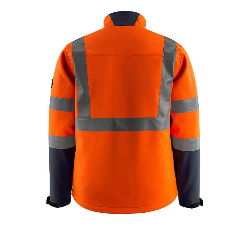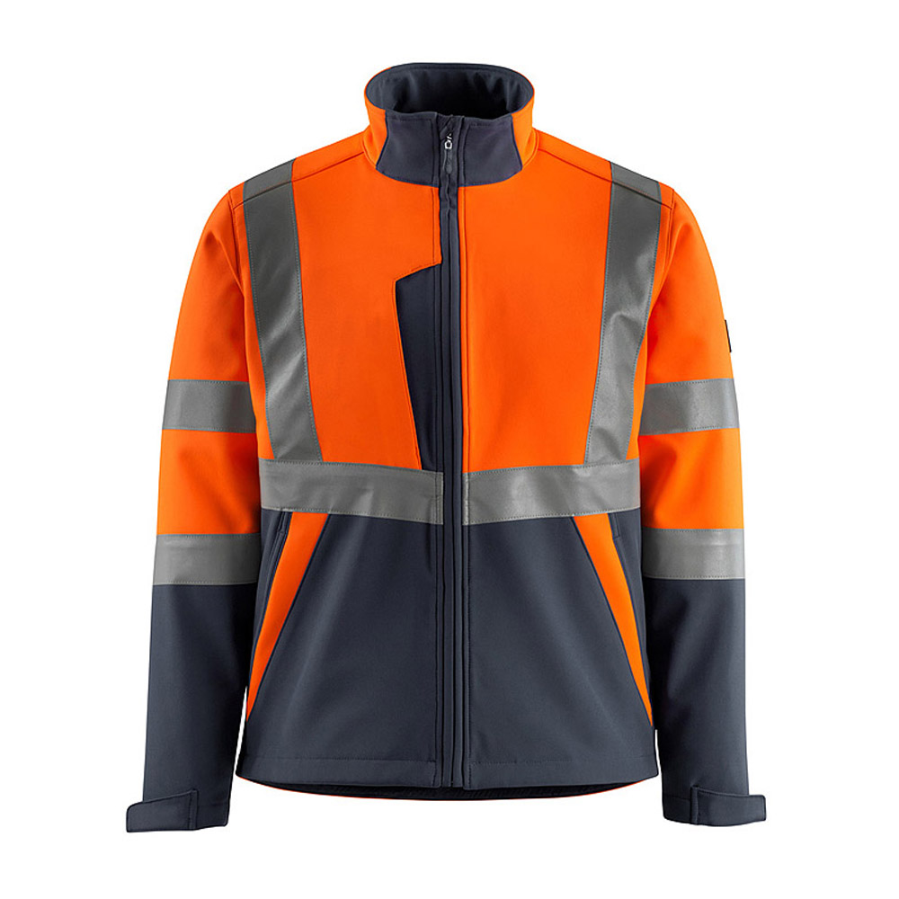 Warnschutz-Softshelljacke, 100% Polyester, 265 g/m². Fleece an der Innenseite. Mit Reflexschulterstreifen und waagerechten Reflexen, Verschluss mit Reißverschluss und inwendiger Wetterschutzleiste, Brusttasche mit Reißverschluss, Vordertaschen, Innentaschen, Klettverschluss an den Handgelenken, Gummizug in der Unterkante. Norm: EN 20471 Kl. 3.