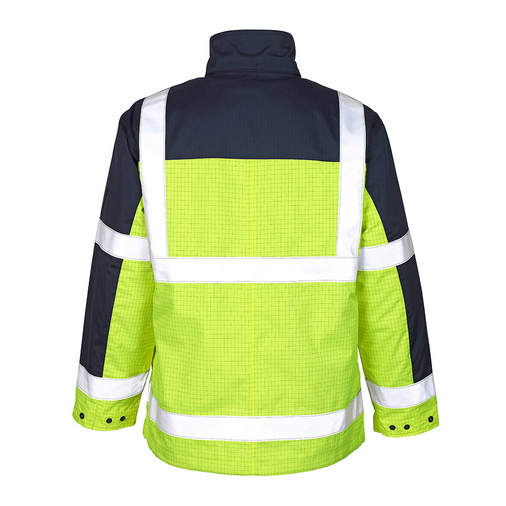 Bequeme Warnschutzjacke aus Stretchstoff mit körperbetonten Schnitt, verstärktem Stoff und Reflexelementen. Material: 50% Polyester/50% Baumwolle, 270 g/m². Produkteigenschaften: 2 Brusttaschen, 2 Seitentaschen, 2 Innentaschen, Oberamtasche, Frontreißverschluss mit kombiniertem Kinn-und Bartschoner sowie Windschutzblende, Steh-/Umlegekragen, Schulter mit Stretcheinsatz, weitenregulierbar Ärmel mit innenliegendem Strickbündchen, verlängerter Rücken. Reflex-Elemente: Segmentiertes und durchgehendes Reflexband kombiniert, 2 Reflexstreifen an Rumpf und Ärmel umlaufend (5cm breit), zusätzliche Reflexstreifen über Schulter sowie an Brust und oberem Rücken (5cm breit) und am Oberarm (2,5cm breit). Norm: EN ISO 20471 Kl. 2.