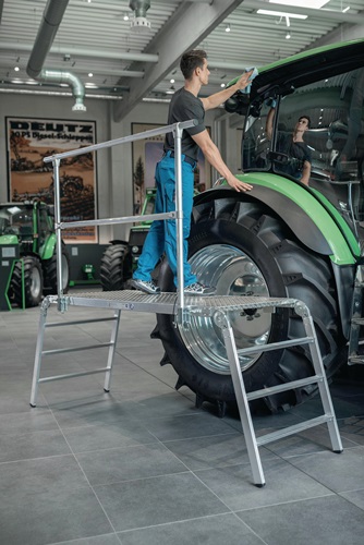 leichte, stabile Aluminium-Konstruktion · einfacher und schneller Aufbau dank vier automatisch verriegelnden Scharnieren · 65 mm tiefe, geriffelte Stufen für den sicheren Auf- und Abstieg · sicheres und bequemes Arbeiten auf geräumiger Standfläche L 1860 x B 750 mm · rutschsichere Plattform aus Aluminium-Warzenblech · ausreichend Platz für zwei Personen plus Arbeitsgeräte und -material · leicht im Transport, platzsparend in der Aufbewahrung · vier integrierte Befestigungsösen zur Aufnahme eines Geländers (Zubehör) · rutschfeste Kunststoffschuhe · max. Gesamtbelastung 500 kg Geländer mit Stecktaschen zur Erhöhung der Arbeitssicherheit gehört nicht zum Lieferumfang und ist als Zubehör erhältlich.