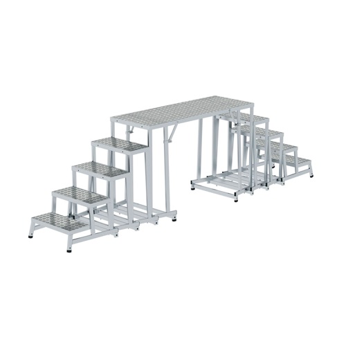 Verschweißte und verwindungsfreie Aluminium-Konstruktion 250 mm tiefe Stufen aus Aluminium-Warzenblech für einen sicheren Stand Rutschfeste Kunststoffschuhe Optionale Erweiterung des Grundmoduls durch Zusatzmodule für eine größere Standfläche oder mehr Stufen Optional Bockrollen für ein leichtes Verfahren von Ort zu Ort oder Bodenbefestigungswinkel für den stationären Einsatz Mit Überstiegsmodul auch als Laufsteg mit beidseitigem Zugang nutzbar Maximale Belastung: 150 kg Das Grundmodul lässt sich mit einem Zusatzmodul individuell erweitern. Das Erweiterungsmodul ist nur in Verbindung mit dem Grundmodul verwendbar.