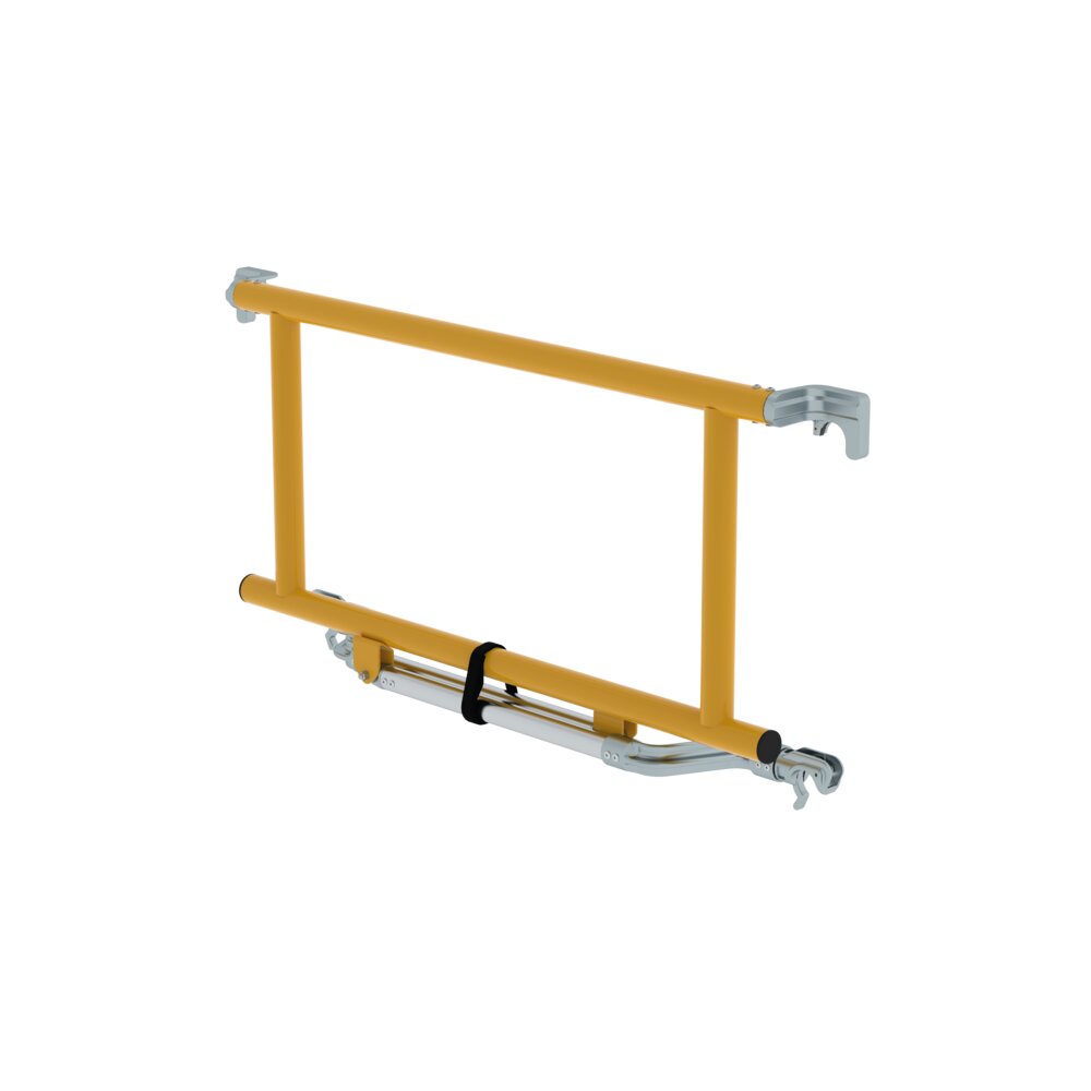 Die Geländer-Befestigungsstiele werden am Alu-Steg 600 in Abständen von 1,57 m / 2,07 m / 2,57 m oder 3,07 m befestigt, damit das Bordbrett des Blitz Gerüst-Systems zwischen die Bordbrettbolzen der Geländer-Befestigungsstiele montiert werden kann. Geländerholm und Zwischenholm, bestehen aus Gerüstrohren, diese werden mit Normalkupplungen am Geländer-Befestigungsstiel in 0,5 m und 1,0 m Höhe angeschlossen.