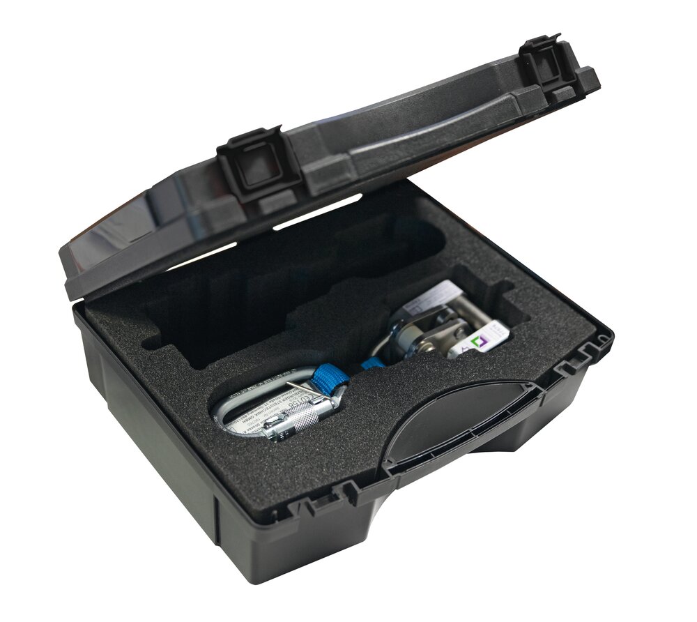 Sichere Lagerung und bequemer Transport von bis zu zwei Sicherungsläufern Passend für GÜFA und GÜFA Flexx Formgefräster Einsatz aus PE-Schaumstoff Koffer aus robustem PT-Kunststoff Abmessungen: 338 x 273 x 123 mm