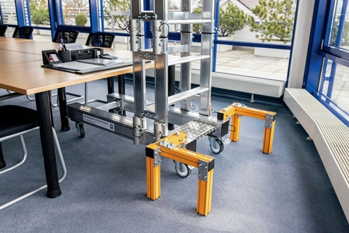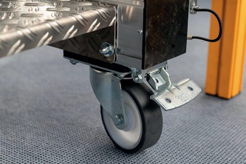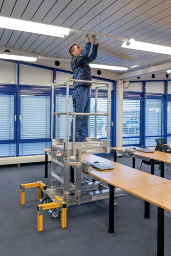 Mobile Plattform aus Aluminium für Arbeitshöhen bis ca. 3,00 m Ermöglicht ein effizientes und sicheres Arbeiten Perfekt zum Unterfahren von und Arbeiten über Schreibtischen oder Arbeitsflächen Werkzeugloser Auf- und Abbau durch eine Person dank Steckverbindungen und Schnellverschlüssen 3-seitiges Geländer · Knieleiste und Sicherungsseil für sicheres Begehen und Stehen Leicht im Transport · platzsparend in der Lagerung Mit optionalem Einsteckteil verlängerbar Vier Lenkrollen Ø 125 mm mit Feststellern Maximale Belastung: 150 kg (1 Person)